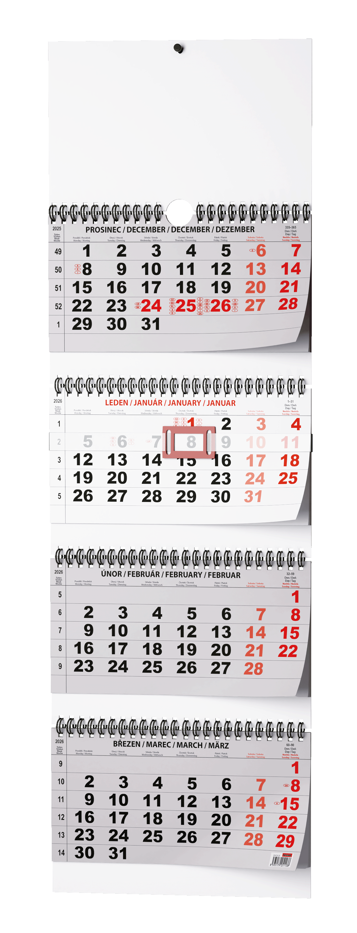 Praktický skládací nástěnný kalendář se čtyřměsíčním kalendáriem a posuvným jezdcem vhodný do Vaší kanceláře.