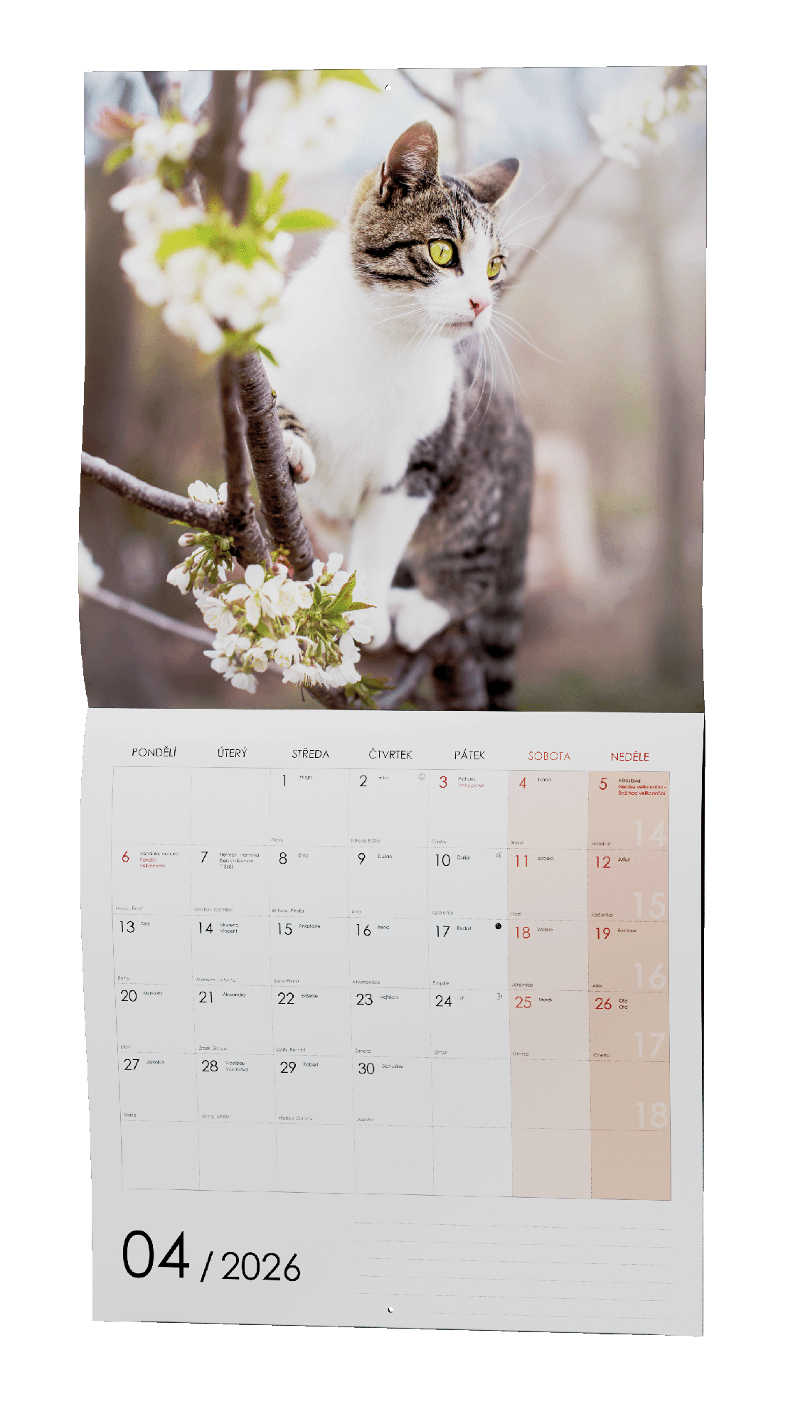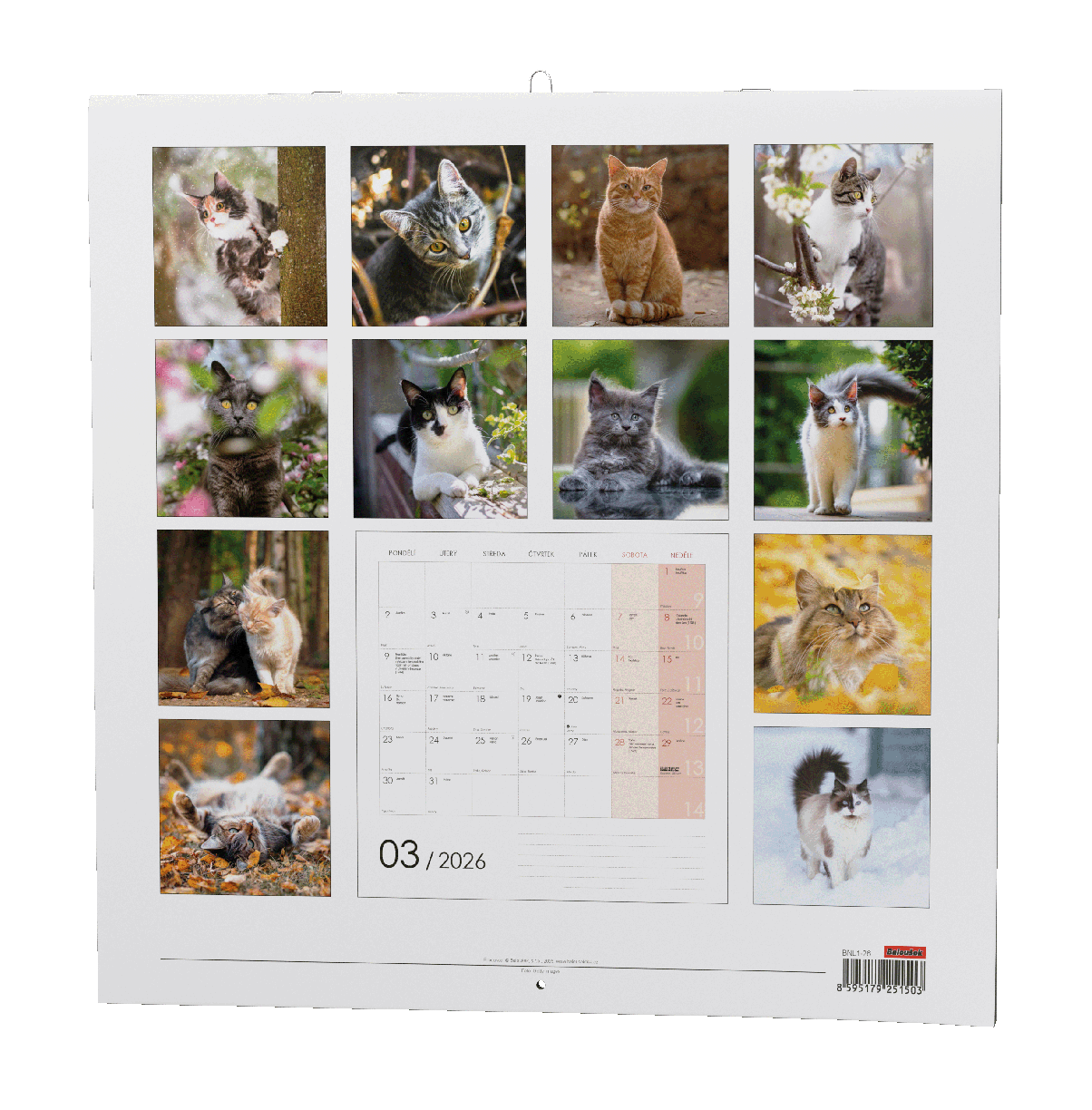 Nástěnný kalendář s měsíčním kalendáriem, v moderním formátu LP desky . Je věnován všem milovníkům koček.