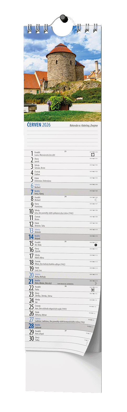 | Barva a materiál: | Papír: křída lesk, 135 g/m2 Obálka: křída lesk 150 g/m2 Karton je z kvalitní bílé lepenky Dvojitá kovová spirála "twin wire" po celé šířce kalendáře s háčkem pro zavěšení | ||||||||||||