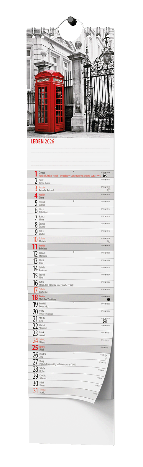 | Barva a materiál: | Papír: křída lesk, 135 g/m2 Obálka: křída lesk 150 g/m2 Karton je z kvalitní bílé lepenky Dvojitá kovová spirála "twin wire" po celé šířce kalendáře s háčkem pro zavěšení | ||||||||||||