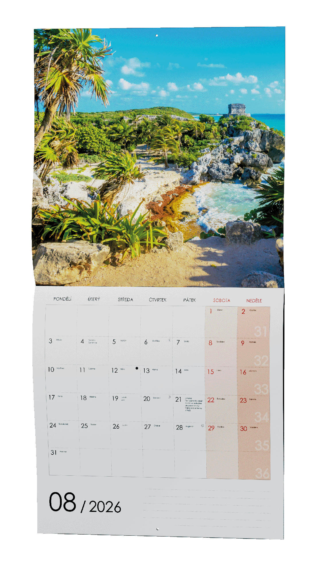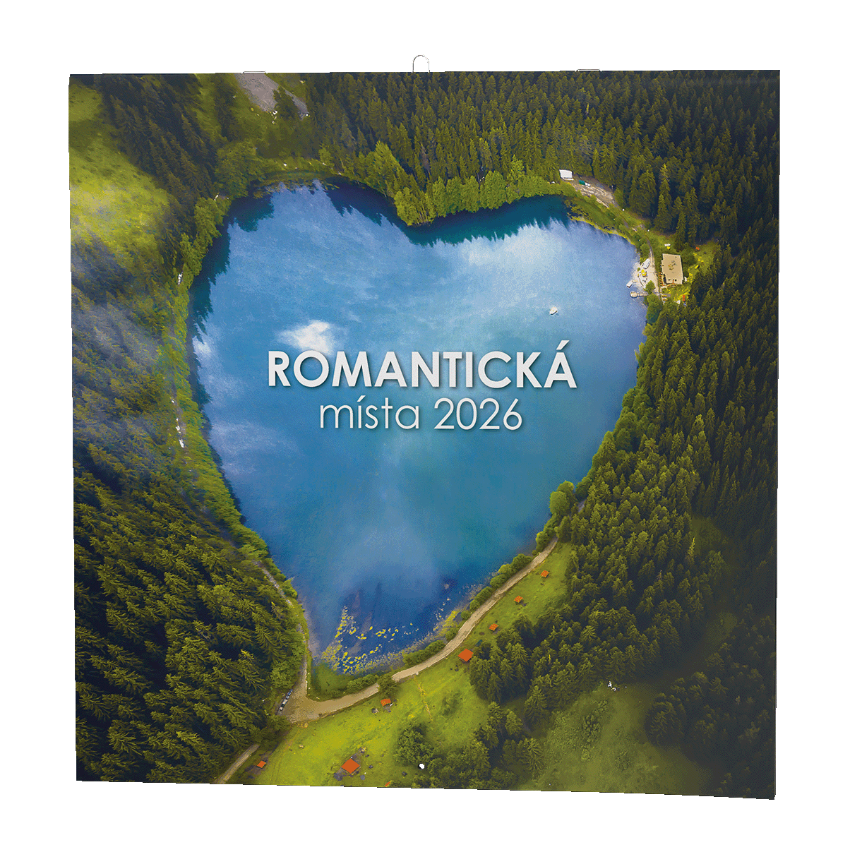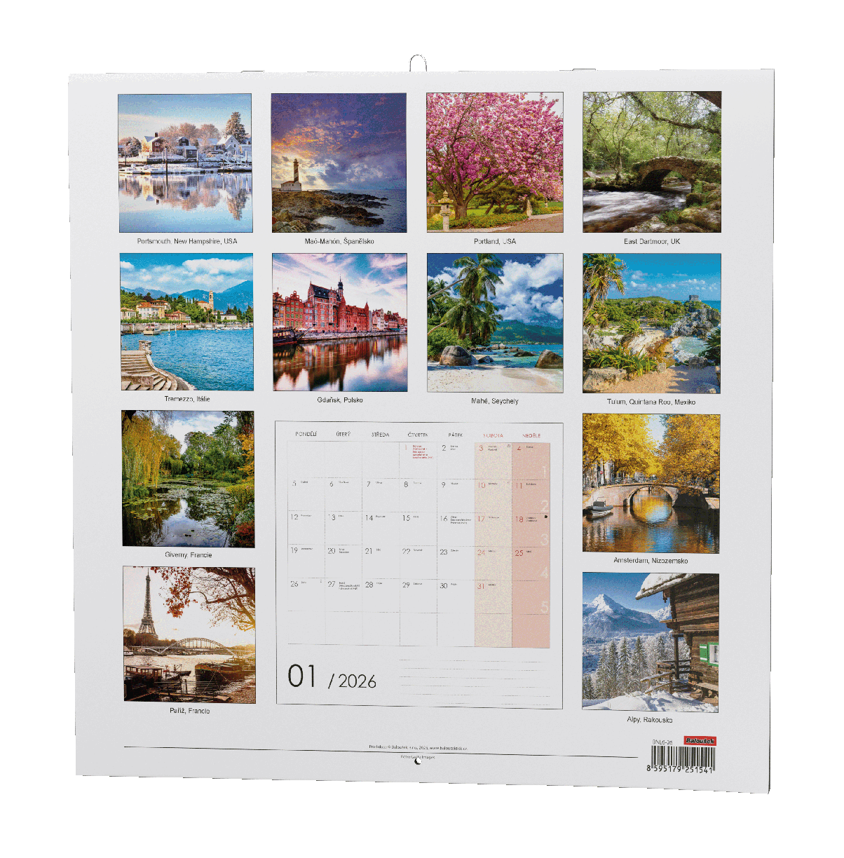 Nástěnný kalendář s měsíčním kalendáriem, v moderním formátu LP desky s kouzelnými obrázky romantických míst.