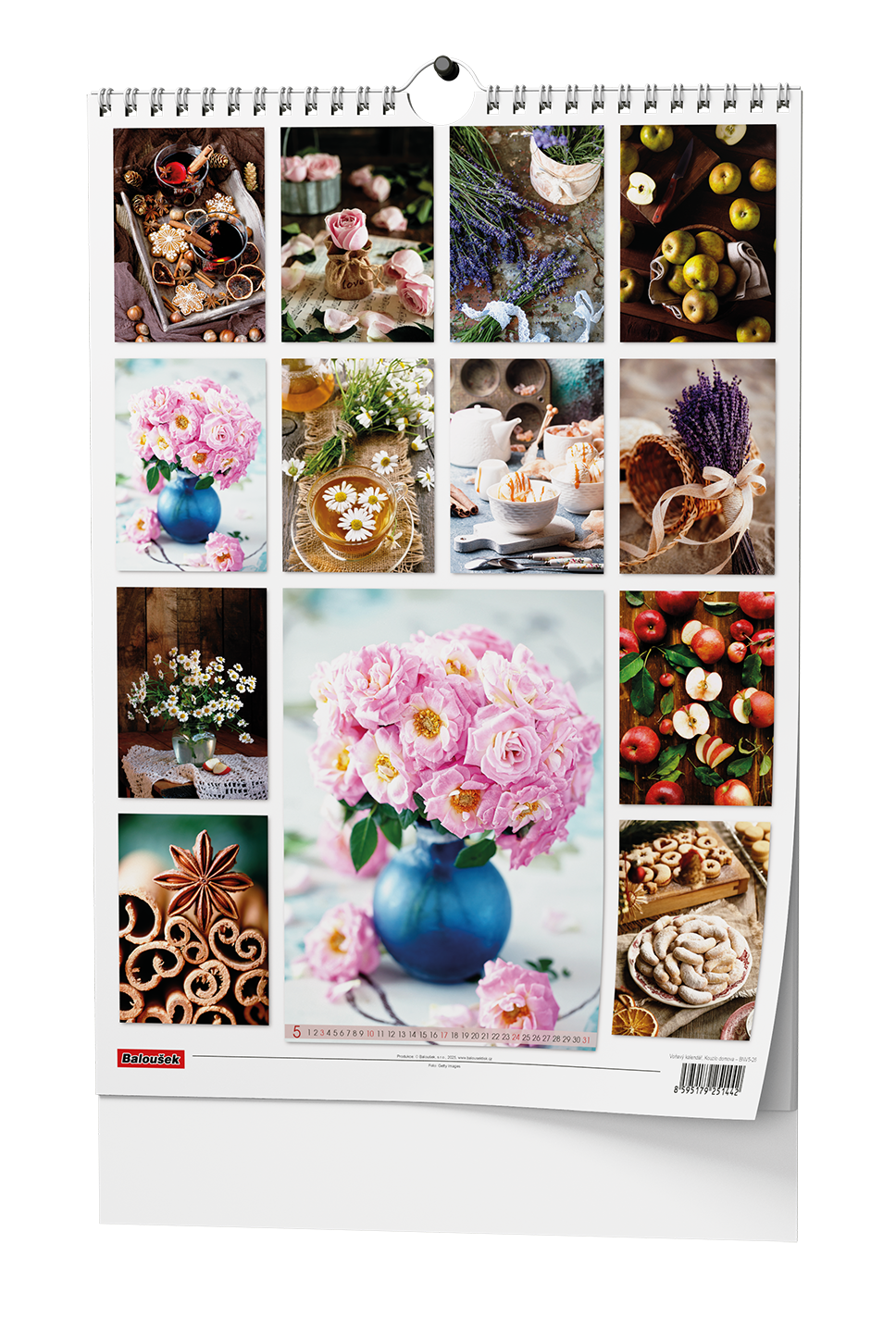 | Barva a materiál: | Papír: křída lesk, 135 g/m2 + voňavý lak Obálka: křída lesk, 150g/m2 Karton je z kvalitní bílé lepenky Dvojitá kovová spirála "twin wire" po celé šířce kalendáře s háčkem pro zavěšení Baleno v průhledném sáčku s průhmatem. | ||||||||||||