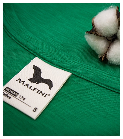 certifikovaná organická bavlna, strukturovaná pletenina slub, lehce vypasovaný střih s bočními švy, úzký lem průkrčníku z vrchového materiálu s 5 % elastanu, vnitřní část průkrčníku začištěna páskou z vrchového materiálu, zpevnění ramenních švů páskou, více o Standardu GOTS