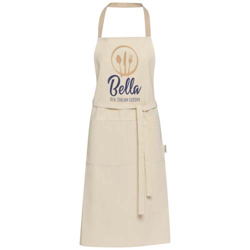 Zástěra Nia je vyrobena ze 100% recyklované bavlny s certifikací GRS s gramáží 200 g/m². Tato zástěra v přírodní bavlněné barvě s krčním úvazem v kontrastní barvě ochrání vaše oblečení při vaření. Zástěra Nia se dvěma kapsami vedle sebe o celkové velikosti 45 × 20 cm a 1 metr dlouhým zádovým úvazem zajišťuje praktičnost i styl v kuchyni.