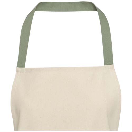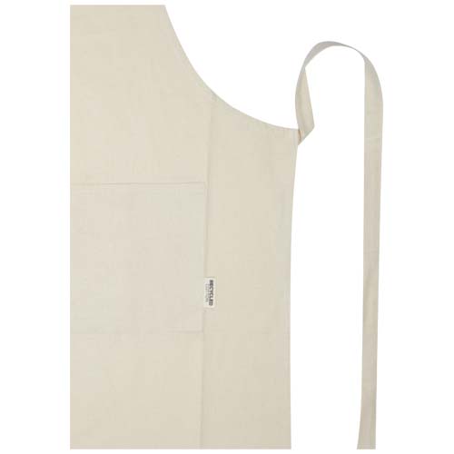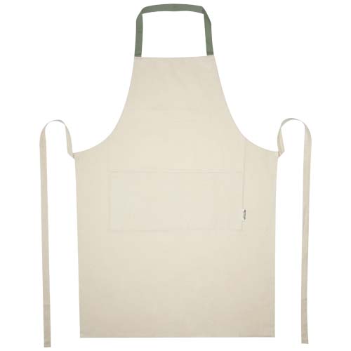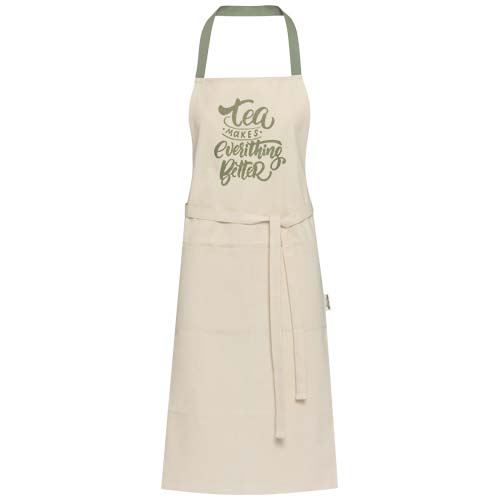 Zástěra Nia je vyrobena ze 100% recyklované bavlny s certifikací GRS s gramáží 200 g/m². Tato zástěra v přírodní bavlněné barvě s krčním úvazem v kontrastní barvě ochrání vaše oblečení při vaření. Zástěra Nia se dvěma kapsami vedle sebe o celkové velikosti 45 × 20 cm a 1 metr dlouhým zádovým úvazem zajišťuje praktičnost i styl v kuchyni.