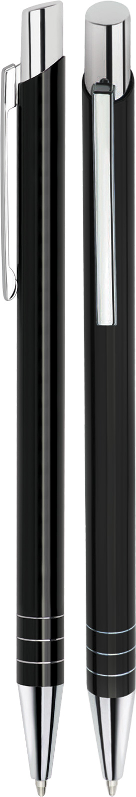 Kovová kuličková propiska v tenkém designu s chromovými doplňky (špička, tlačítko, spona a tři designové proužky na těle propisky). Náplň pera je modrá.
