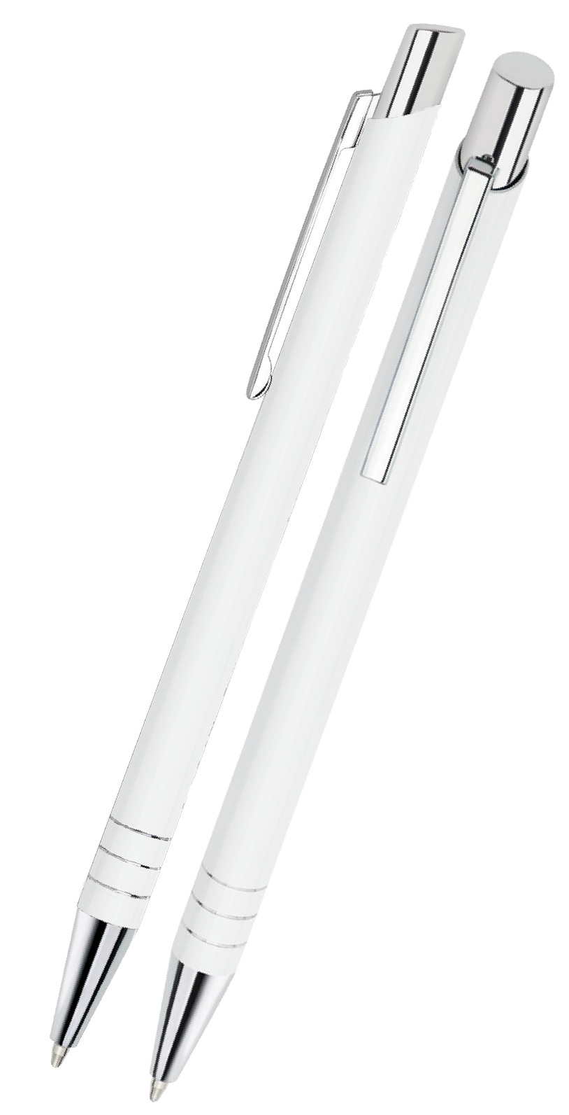 Kovová kuličková propiska v tenkém designu s chromovými doplňky (špička, tlačítko, spona a tři designové proužky na těle propisky). Náplň pera je modrá.