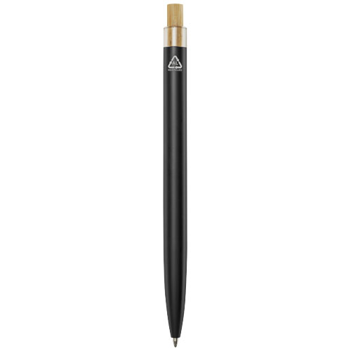 Kuličkové pero Nooshin je vyrobeno z recyklovaného hliníku, což vyžaduje méně energie než výroba hliníku z nerostných surovin. Snižuje také množství odpadu na skládkách a pomáhá šetřit přírodní zdroje s cílem snížit emise skleníkových plynů. Tlačítko je vyrobeno z bambusu. Barva inkoustu: Modrá. Délka psaní: 800 metrů. Rozměr hrotu: 1,00 mm.