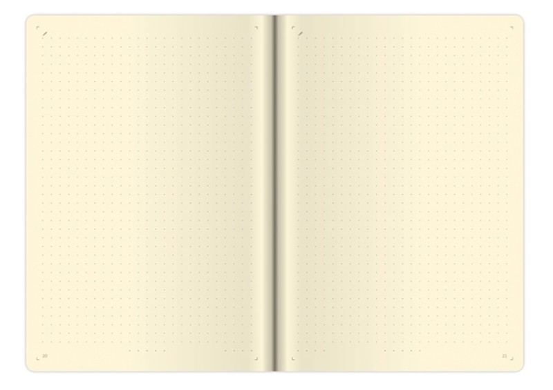 192 stran, papír chamois, tečkovaný - tenké čáry se skládají z malých teček, což umožňuje různé využití stránky pro kreslení nebo náčrtky.