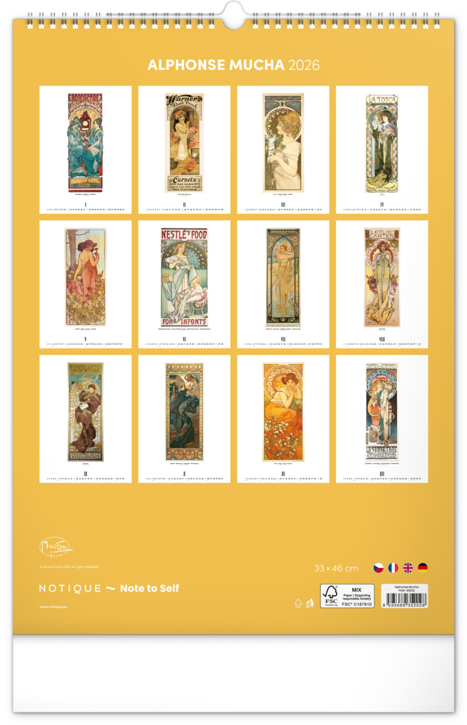 NOTIQUE Nástěnný kalendář Alfons Mucha 2026, 33 x 46 cm