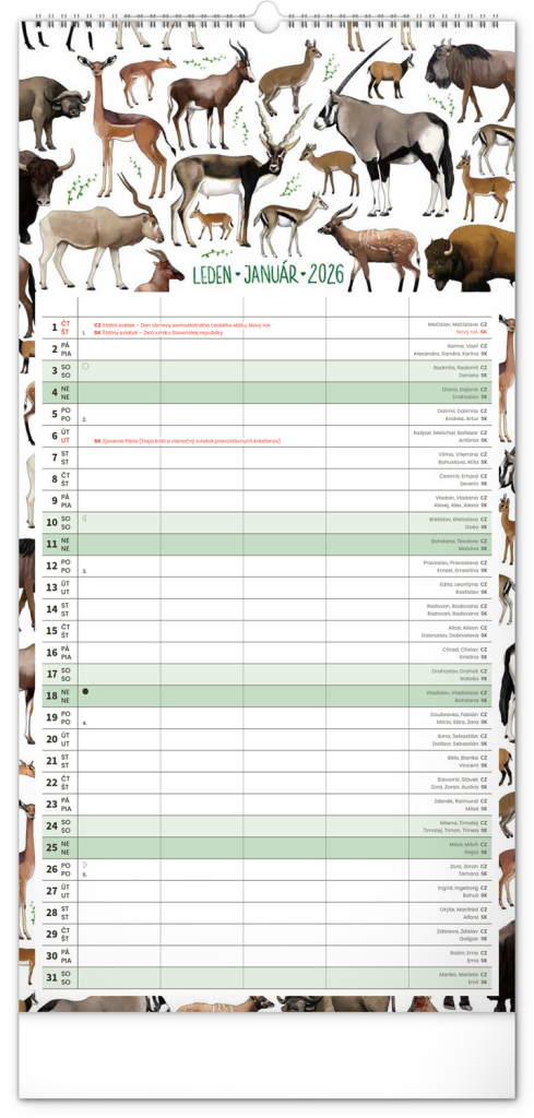 České a slovenské kalendárium a samostatný plánovač aktivit až pro čtyři členy domácnosti doplňují krásné ilustrace zvířat. Nechybí státní svátky ani měsíční fáze.