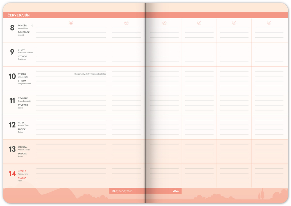 Praktický diář pomůže při plánování aktivit členů rodiny a chodu celé domácnosti. Rozdělen je do týdnů, kde můžete sledovat a do připravených sloupců zapisovat úkoly jednotlivých rodinných příslušníků. Nechybí ani rozvrh hodin pro školáky, nákupní seznamy a prostor pro všechny další důležité poznámky.