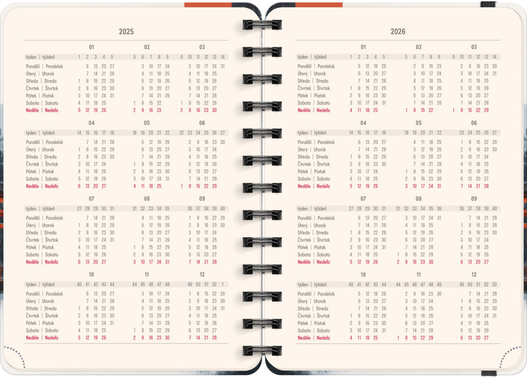 Osmnáctiměsíční diář obsahuje přehled na rok 2025 a 2026, seznam českých a slovenských jmen, česko-slovenské týdenní řádkové kalendárium se jmény a svátky a prostor na poznámky. Kalendárium začíná v červenci 2025 a končí v prosinci 2026.