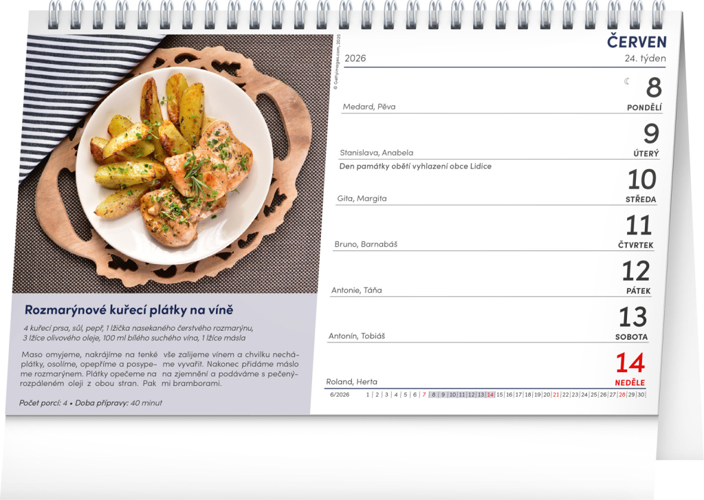 Pro všechny, kteří hledají inspiraci při vymýšlení nových jídel, je tu stolní kalendář nabitý těmi nejzajímavější recepty. Najdete zde 53 receptů, jejichž základem je poctivá domácí kuchyně, kterou vyznávaly už naše babičky. Týdenní stolní kalendář s českými jmény obsahuje také svátky, památné dny, měsíční fáze a přehled na celý rok 2026 a 2027.