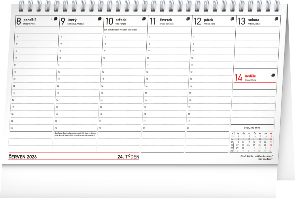 Přehledný daňový kalendář, díky kterému nezapomenete na žádnou daňovou povinnost, a navíc se seznámíte s řadou zajímavých citátů slavných osobností. Sloupcové kalendárium obsahuje měsíční přehled v každém týdnu, znamení zvěrokruhu, jména, svátky a památné dny.