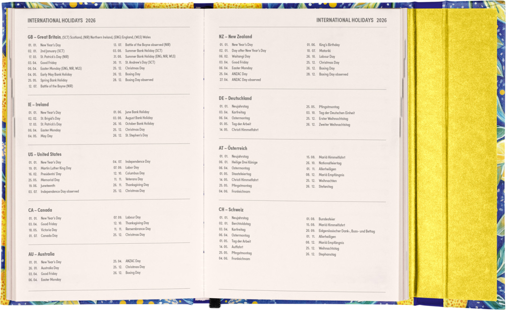 Týdenní diář v anglickém jazyce s mezinárodními svátky a praktickým magnetickým uzavíráním je ideální volbou pro ty, kteří chtějí mít své plány přehledně pod kontrolou. Nabízí horizontální rozložení ve verzi týden na dvou stranách s prostorem pro poznámky. Součástí jsou praktické měsíční přehledy, ideální pro plánování dovolených či prázdnin.