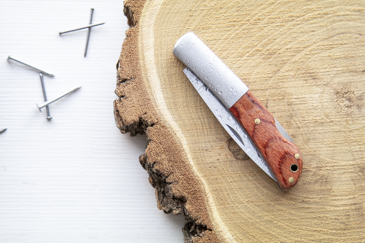 Kapesní nůž z nerez oceli s dřevěnou rukojetí.