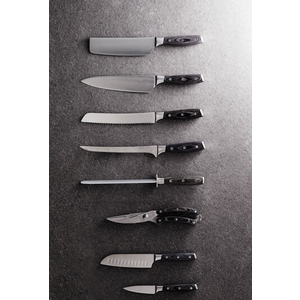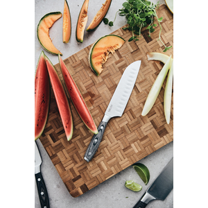 Nůž Santoku z německé oceli X50CrMoV15 s rukojetí ze dřeva pakka. Díky snadno uchopitelné rukojeti a vynikajícímu vyvážení čepele je práce s nožem pohodlná a snadná. Velikost: 14cm čepel.