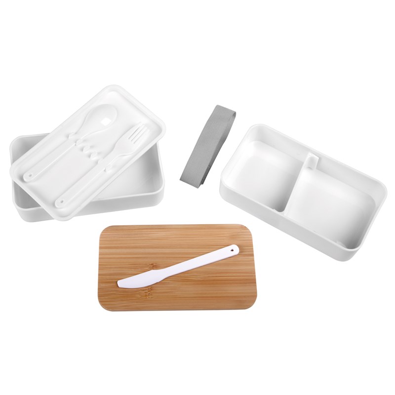 Obědový box s gumičkou, která pevně drží víko, 2 samostatné boxy (každý o objemu cca 550 ml), víko mezi přihrádkami s příbory (nůž, vidlička, lžíce), pohyblivá vložka pro oddělení potravin v boxu, bambusové víko lze použít také jako prkénko na krájení.
