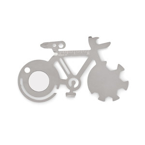 Multifunkční nářadí 11v1 z nerezové oceli ve tvaru jízdního kola. Otvírák na lahve, nůž, pravítko nebo křížový šroubovák a další.