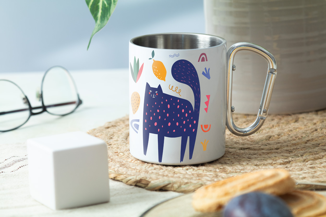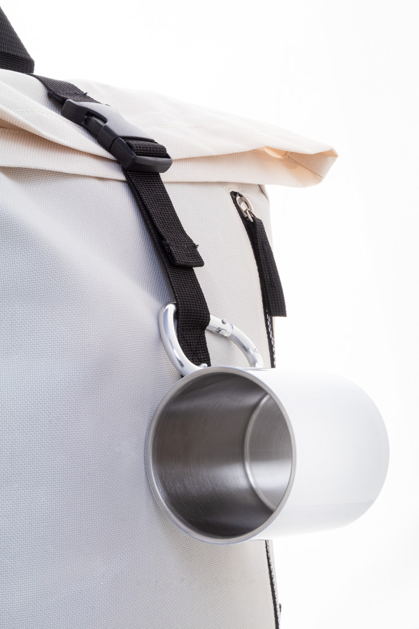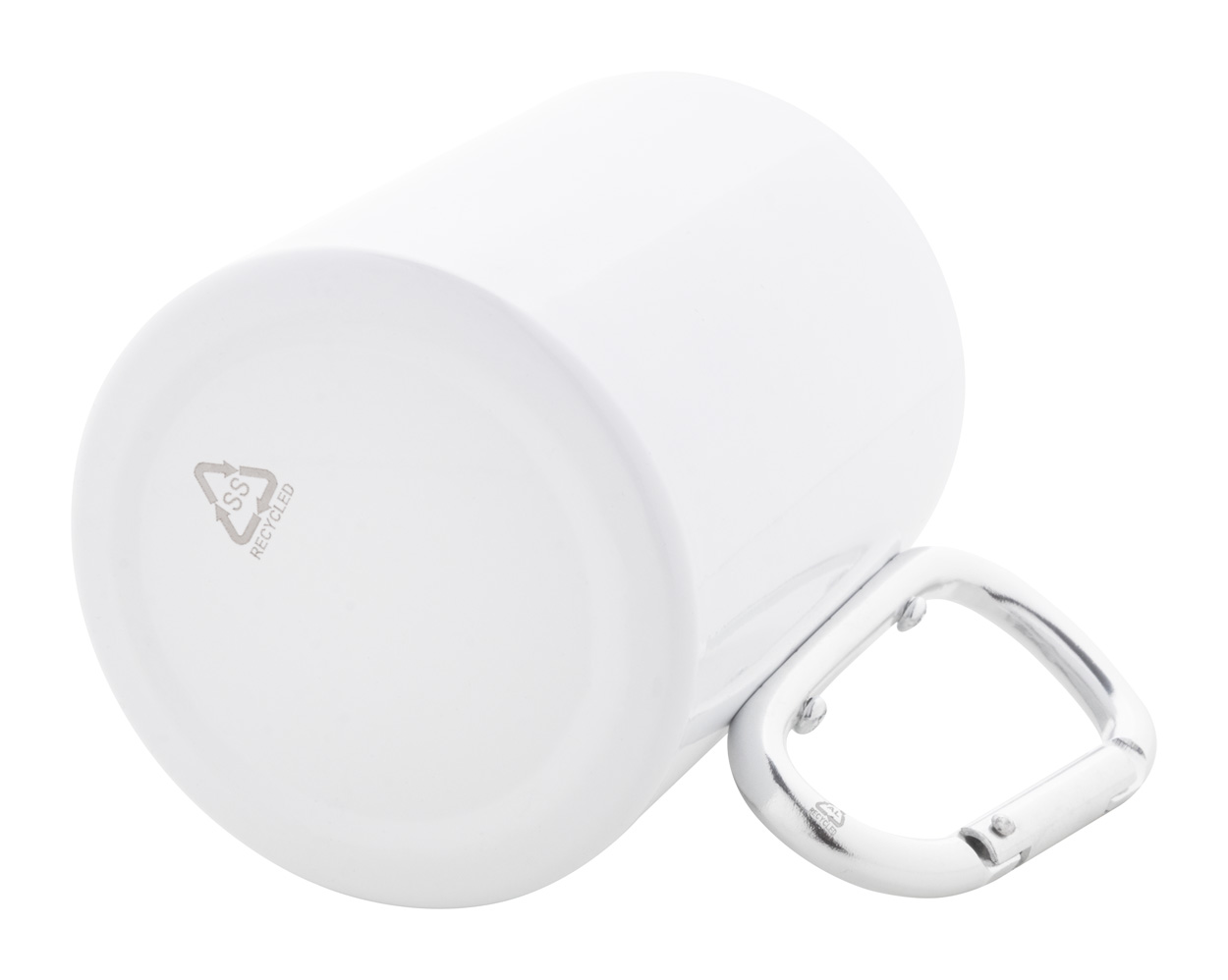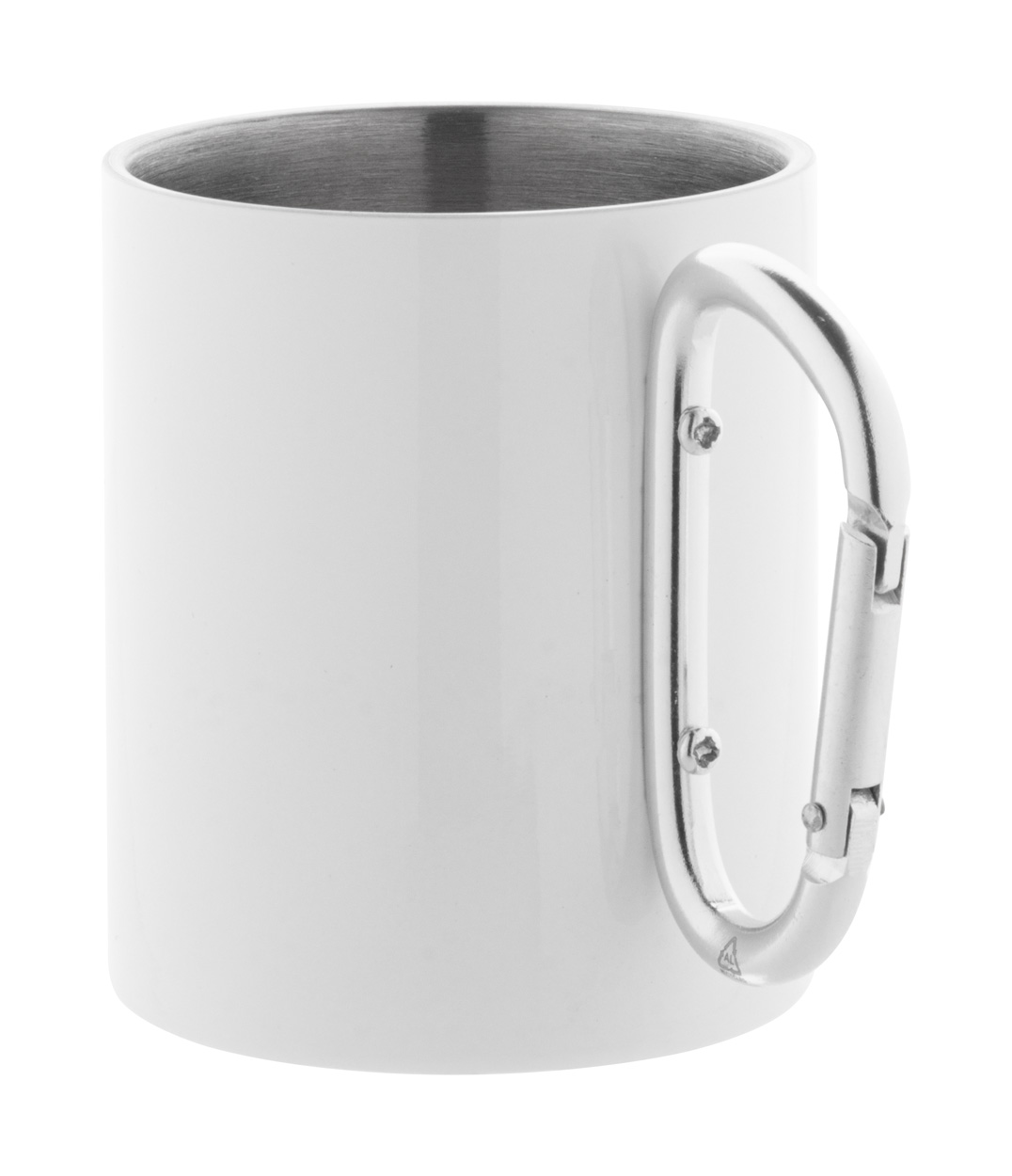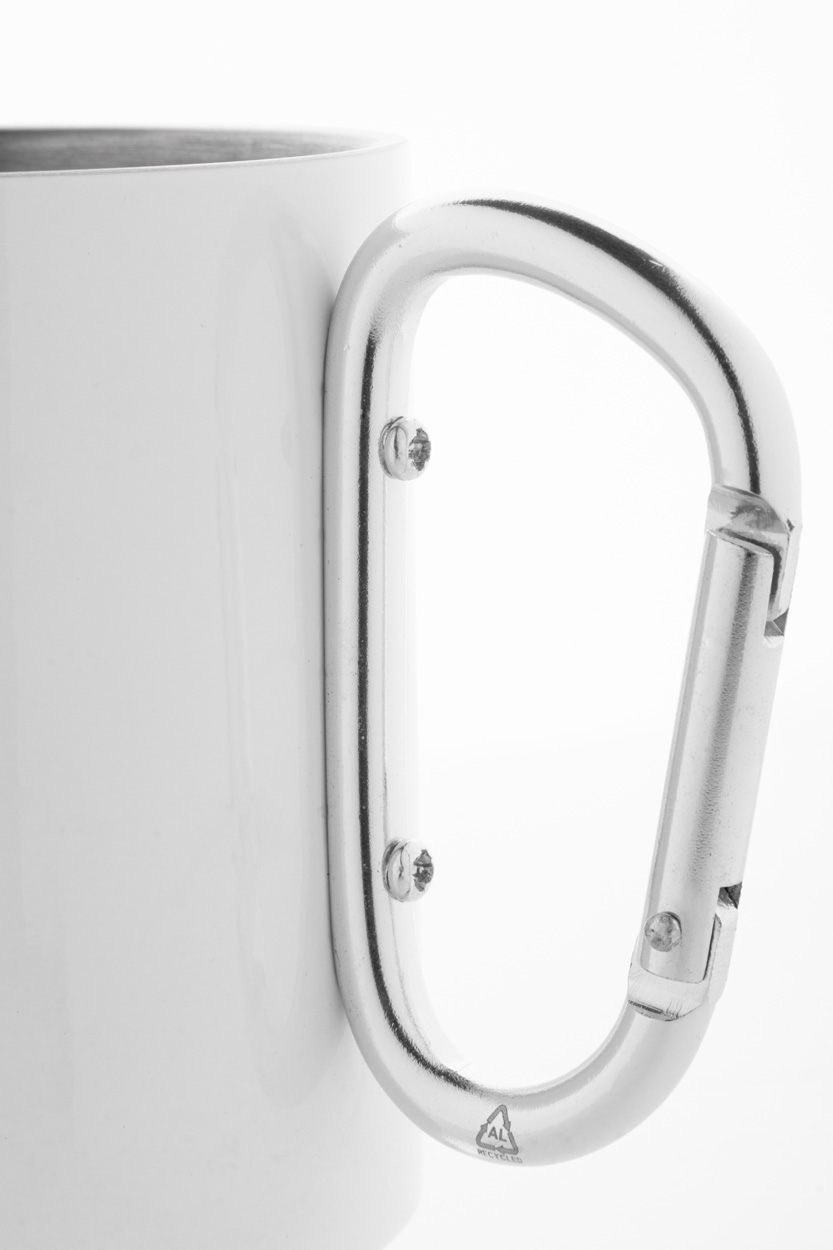 Dvoustěnný termo hrnek na sublimaci z recyklované nerezové oceli s karabinou z recyklovaného hliníku. 300 ml. V kraftové papírové krabici.