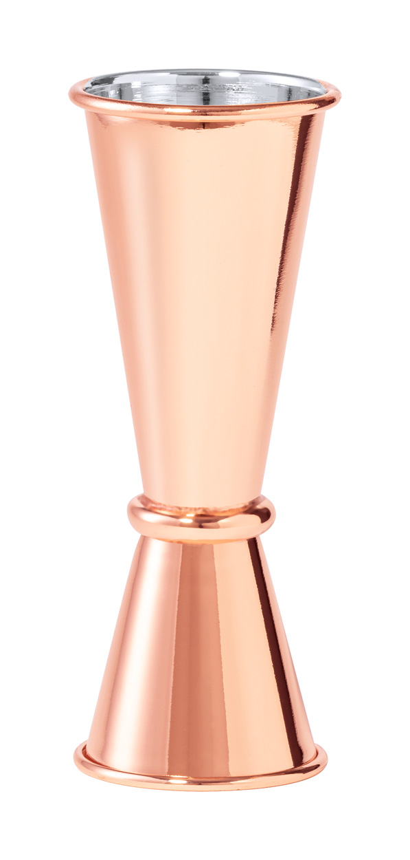 Odměrka z nerez oceli s měděnou povrchovou úpravou o objemu 50 nebo 25 ml.