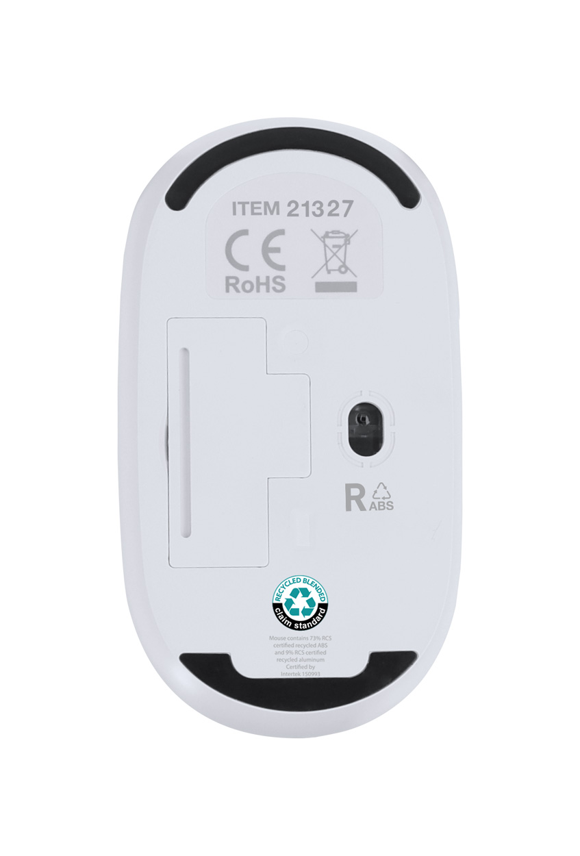 Bezdrátová optická myš v pouzdře z recyklovaného ABS plastu a recyklovaného hliníku. Funguje na 1 AA baterii, dodává se bez baterie.