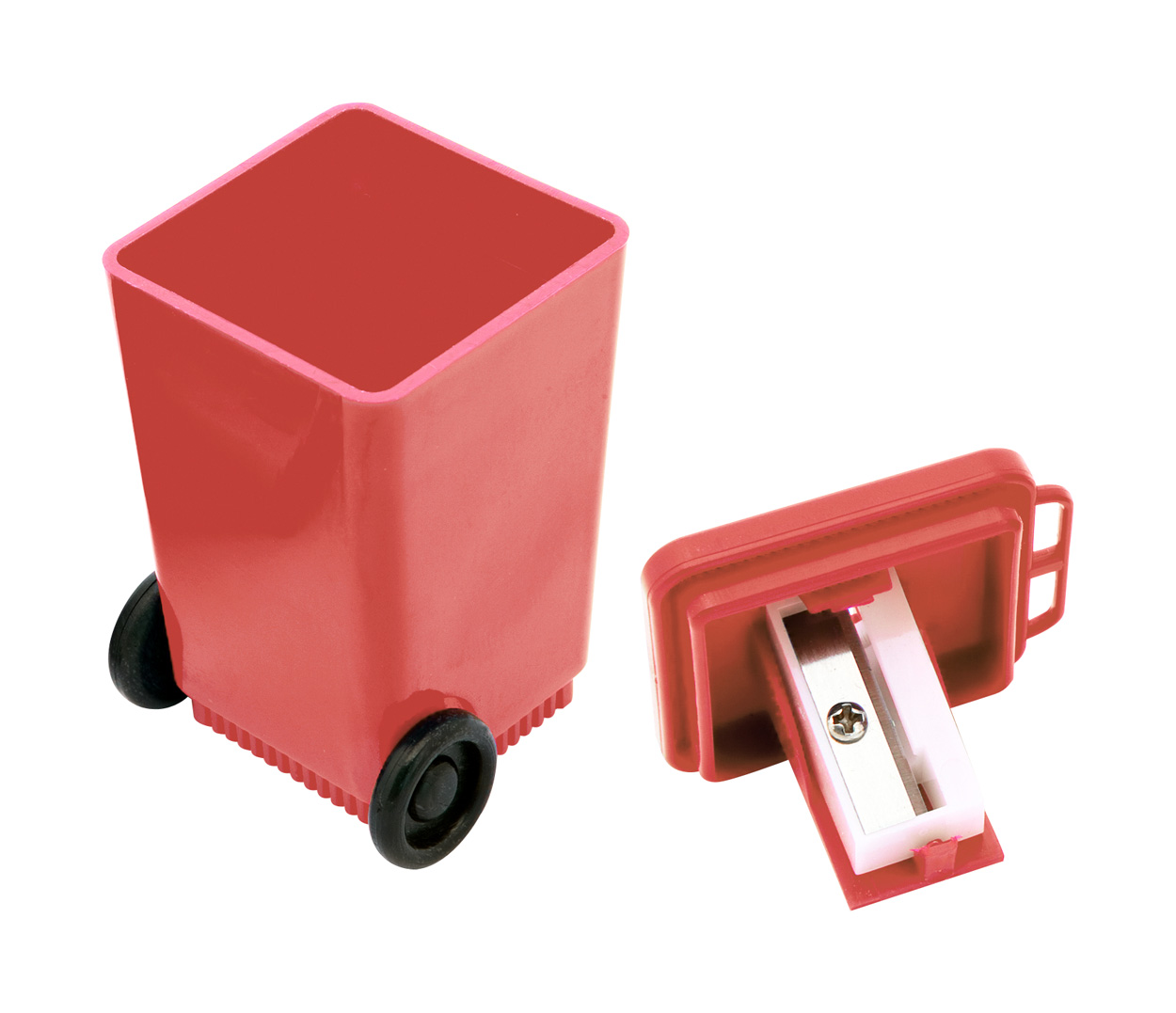 Plastové ořezávátko ve tvaru odpadkového koše.