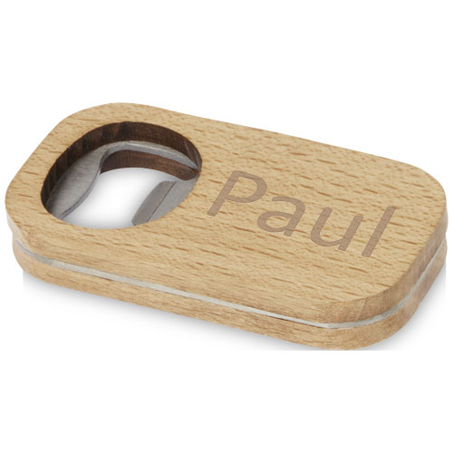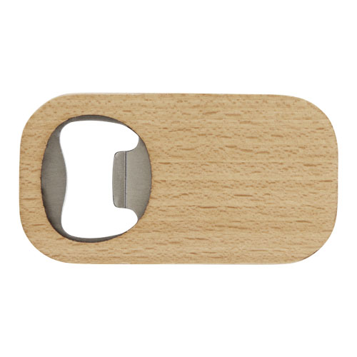 Nerezový otvírák na lahve s dřevěným povrchem.