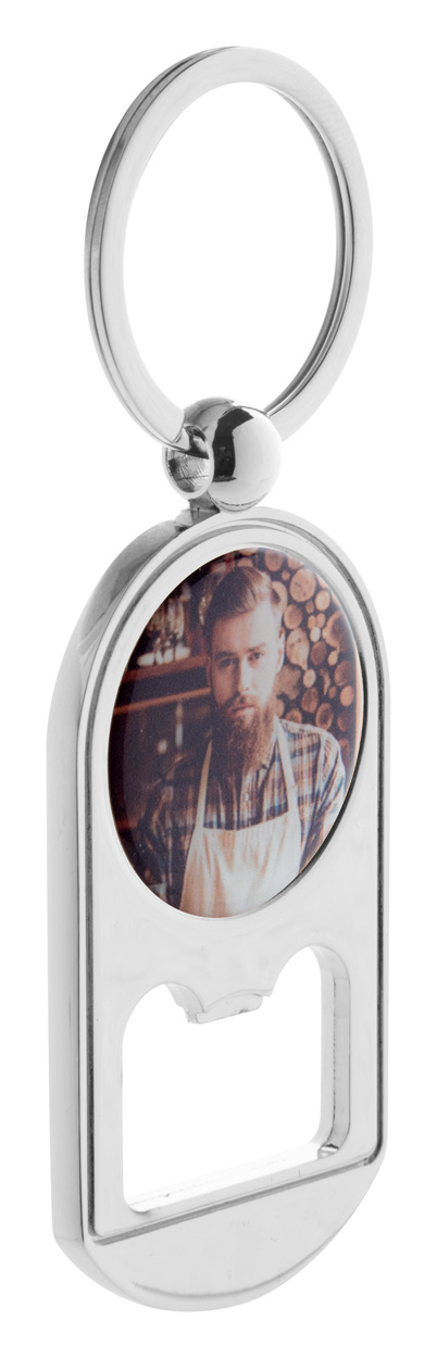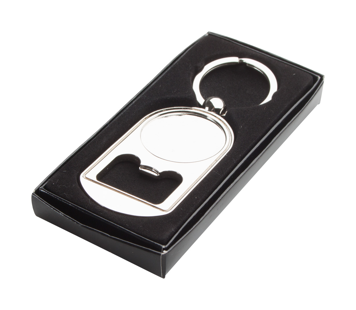 Kovový otvírák na láhve s kroužkem na klíče a epoxy potiskem, v černé dárkové krabičce. Cena zahrnuje epoxy potisk, nezahrnuje tiskovou přípravu. Min. mn.: 100 ks.
