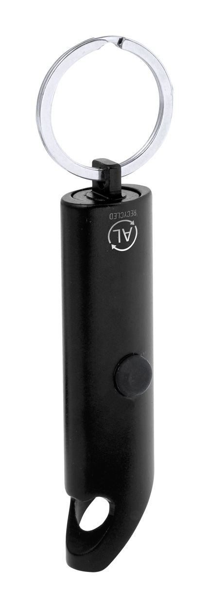 Mini baterka z recyklovaného hliníku se 3 LED diodami, otvírákem na láhve a přívěskem na klíče. S knoflíkovou baterií.