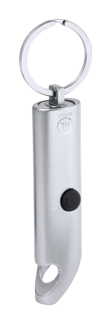 Mini baterka z recyklovaného hliníku se 3 LED diodami, otvírákem na láhve a přívěskem na klíče. S knoflíkovou baterií.