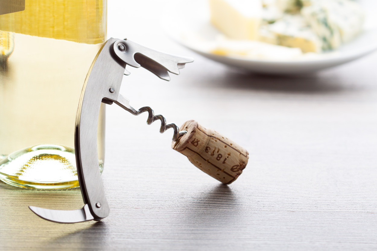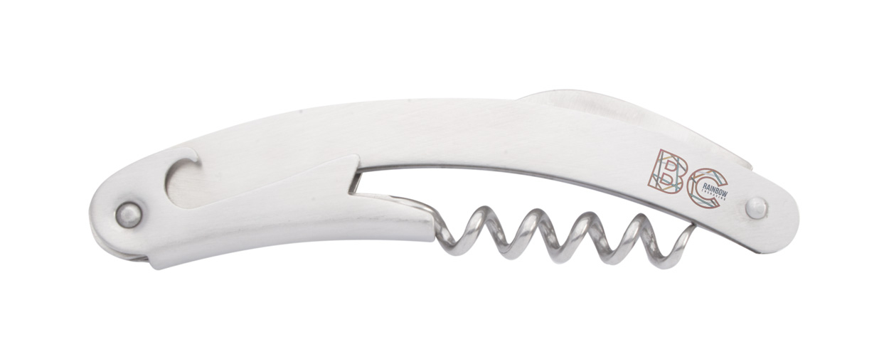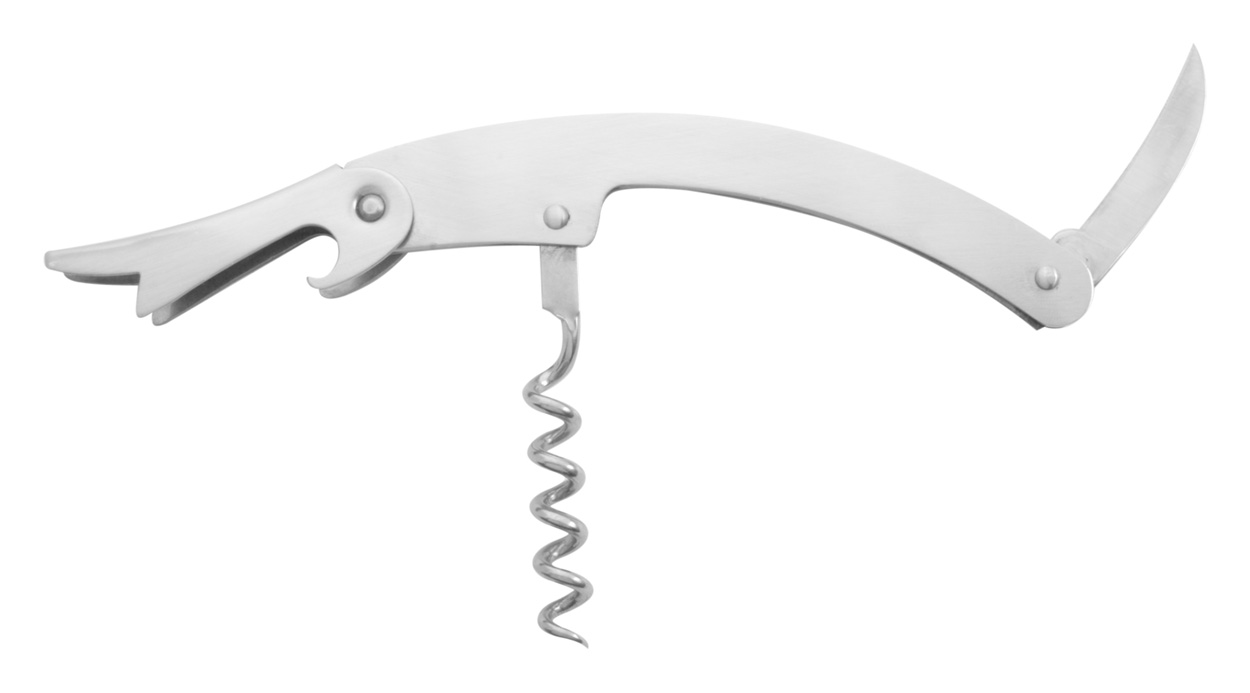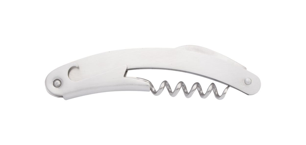 Kovový otvírák na lahve, malý nožík a vývrtka.