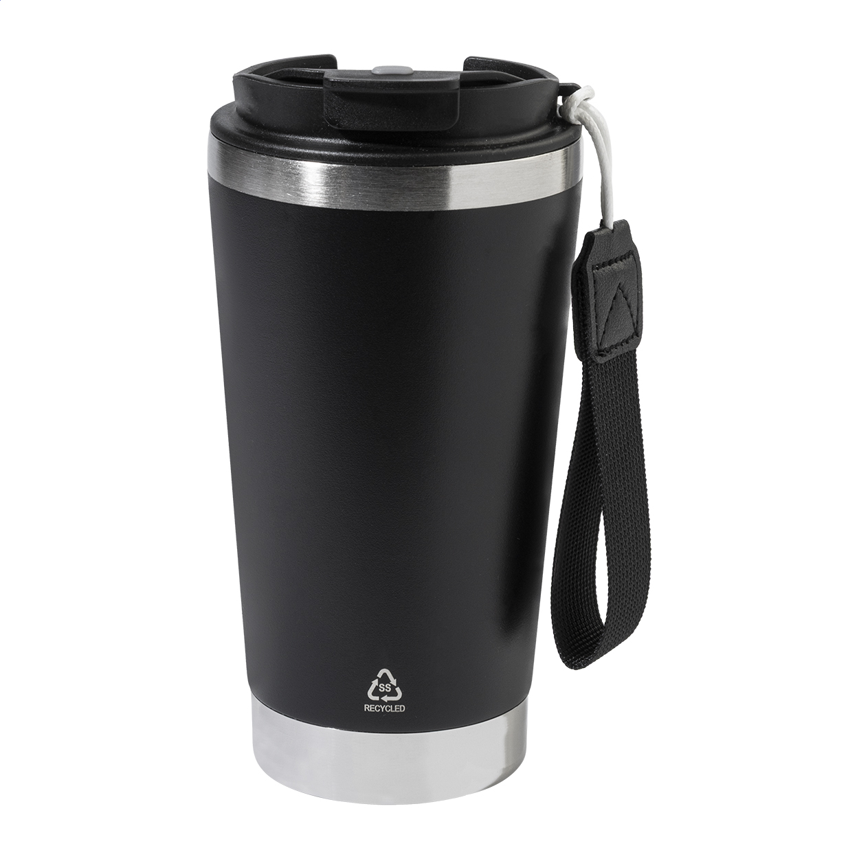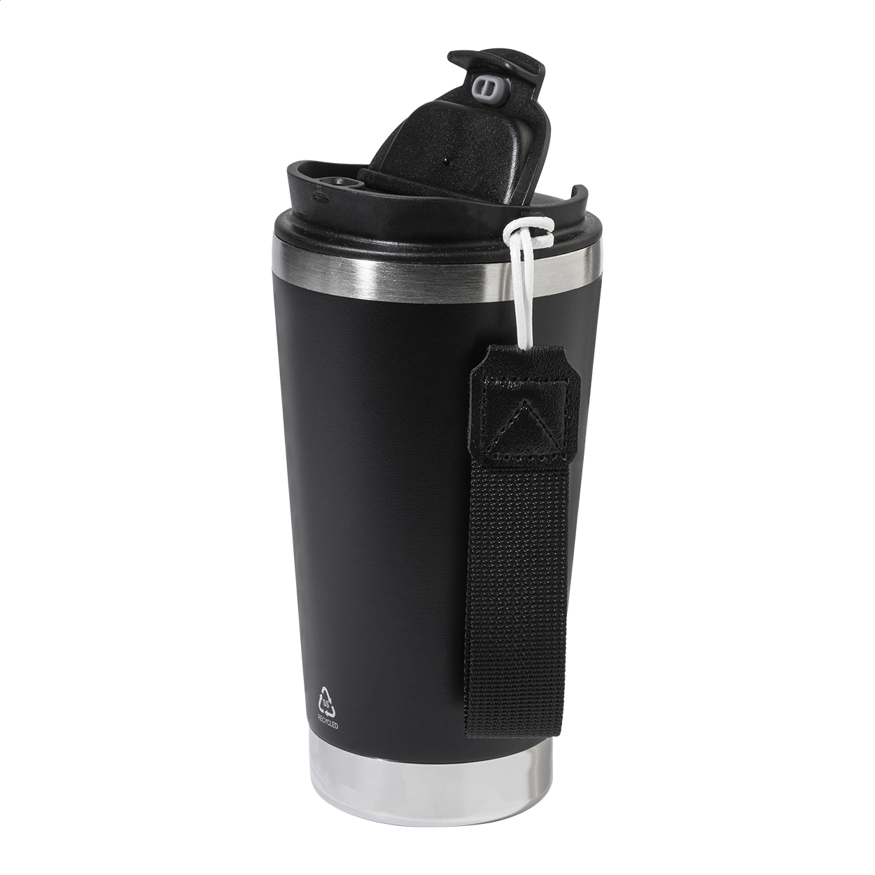 Dvoustěnný termo hrnek z recyklované nerezové oceli s víčkem na pití z PP a páskem na přenášení v odpovídající barvě. 430 ml.