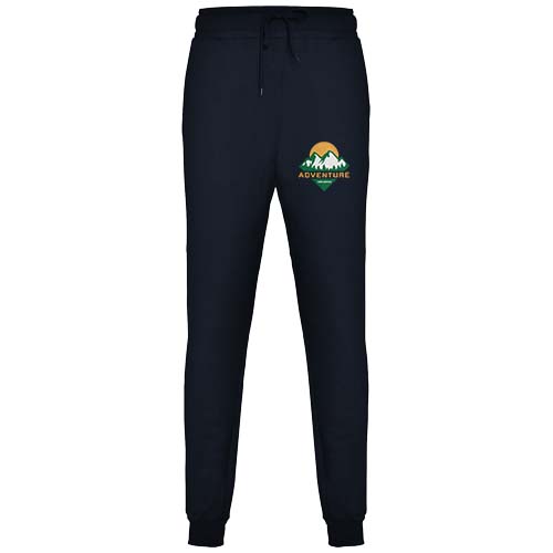 Sportovní kalhoty se širokým nastavitelným pasem, stahovací šňůrkou, přiléhavými kotníkovými manžetami, zesílenými švy, žebrovanými bočními kapsami a zadní rohovou kapsou s prošitým průhledem. Odnímatelný štítek.