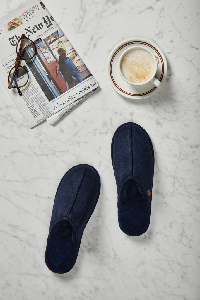Nazouvací pantofle s příjemnou plyšovou vnitřní částí a elegantní semišovou vnější částí. Pevná polstrovaná podrážka nabízí mimořádný komfort. Dostupné ve dvou velikostech: S/M (EUR 36-40) a L/XL (EUR 41-45).