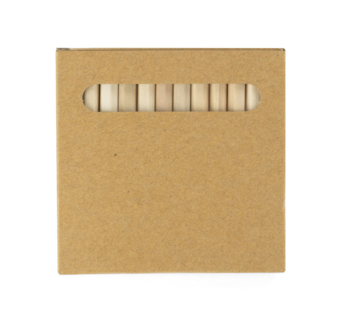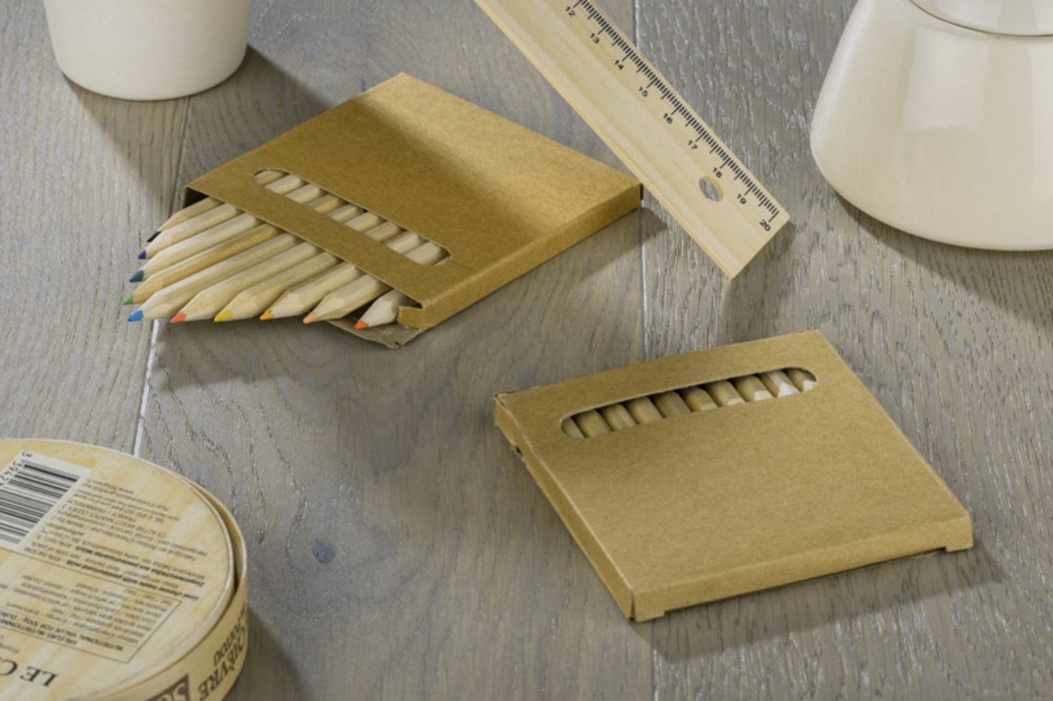 Dřevěné 12barevné tužky. Balené do praktické kartonové krabičky s okénkem. Logo může být tisknuto na kartonovou krabičku.