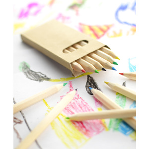 Dřevěné 6barevné tužky. Balené do praktické kartonové krabičky s okénkem. Logo může být vytisknuto na kartonové krabičce.