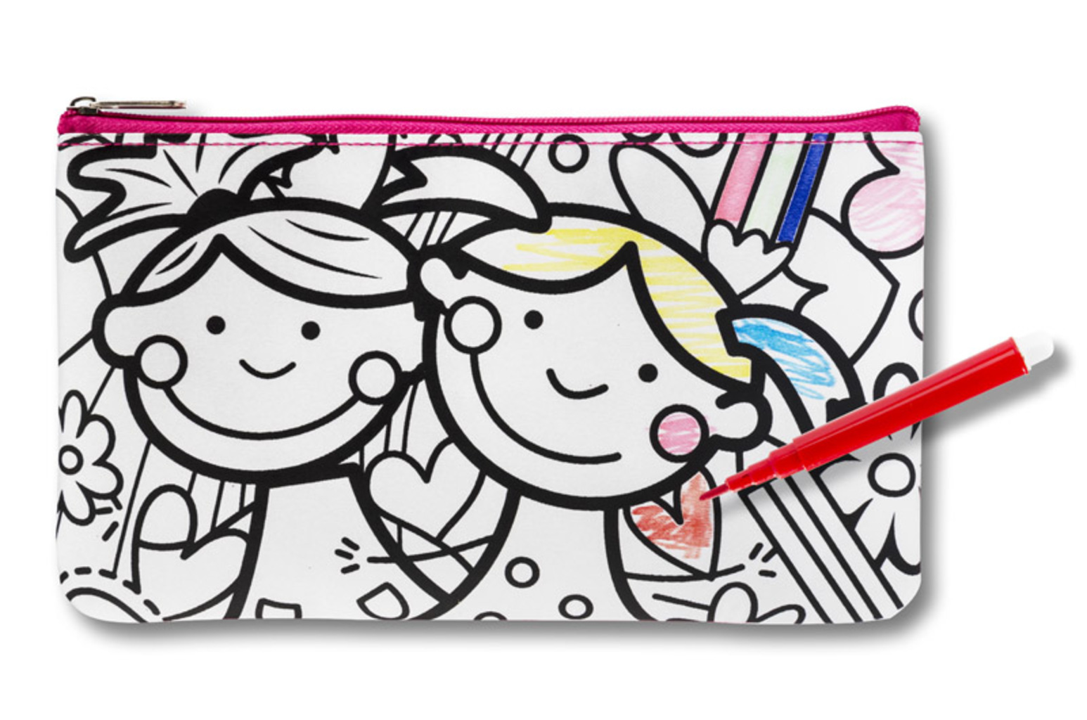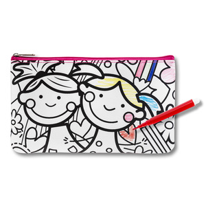 Pouzdro na tužky s vzorem pro samostatné kreslení. Dárek, který zahrnuje a přináší radost. Součástí je 6 barevných markerů. Jednokomorové pouzdro na tužky s zipem.