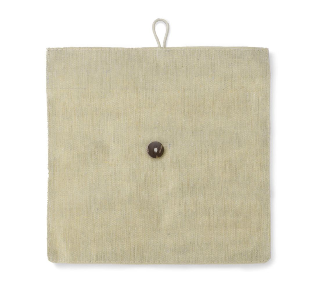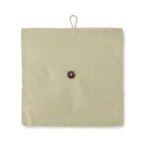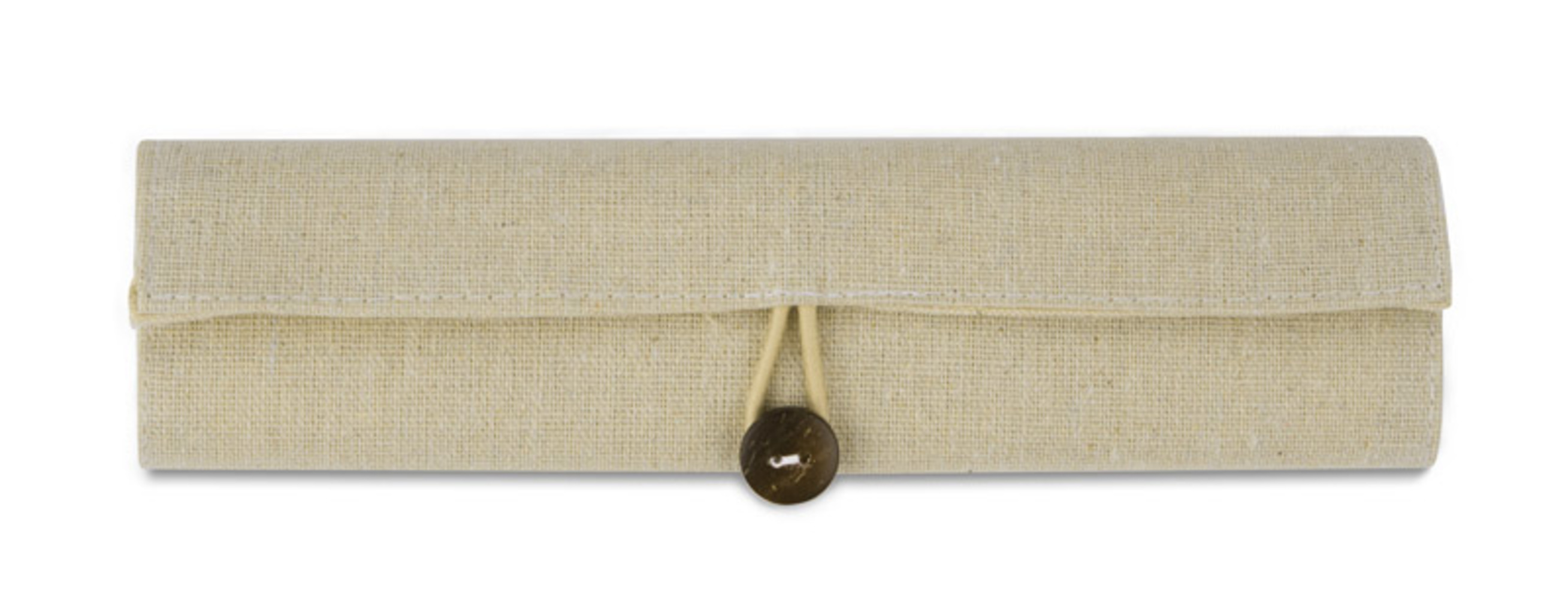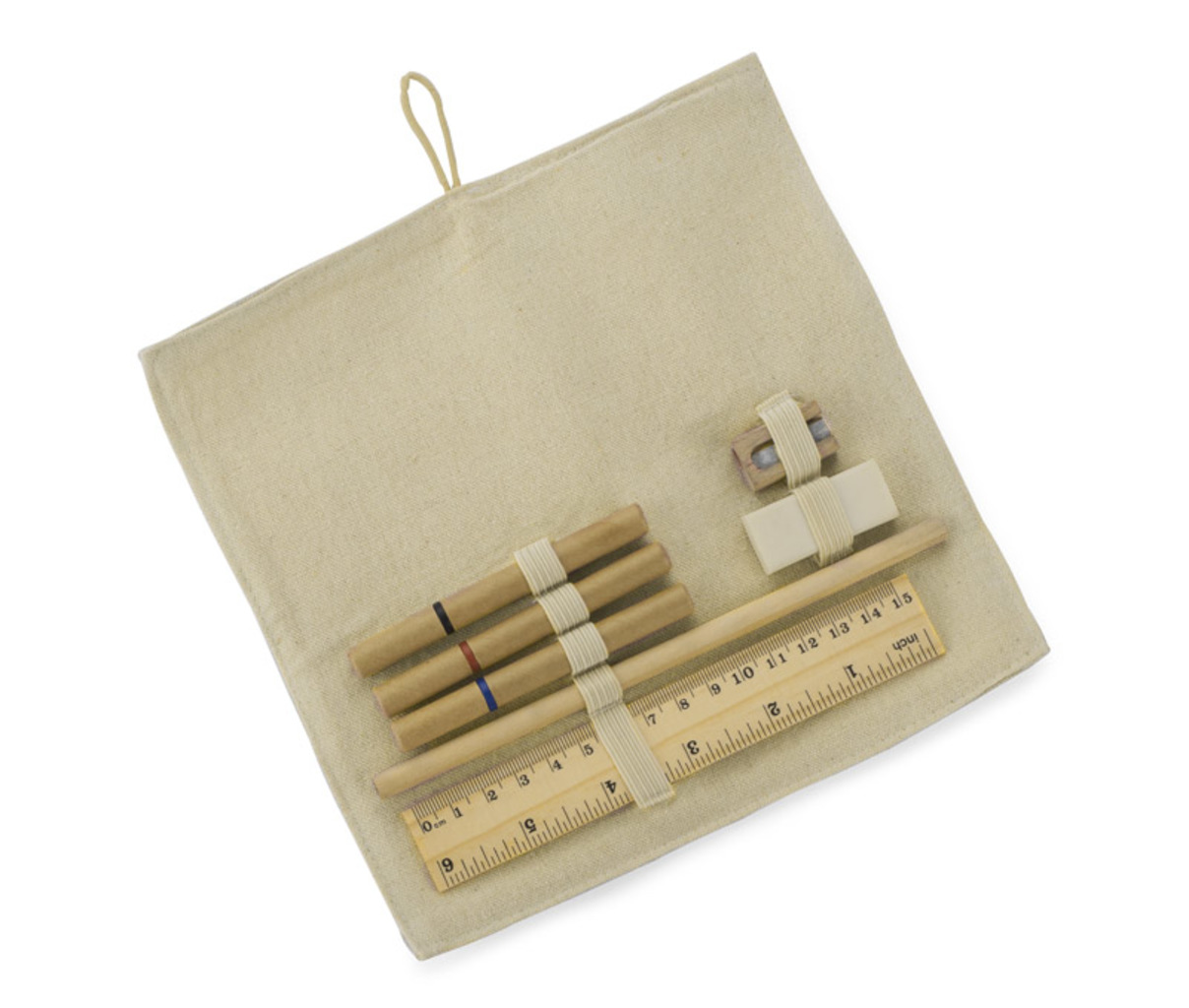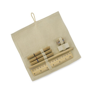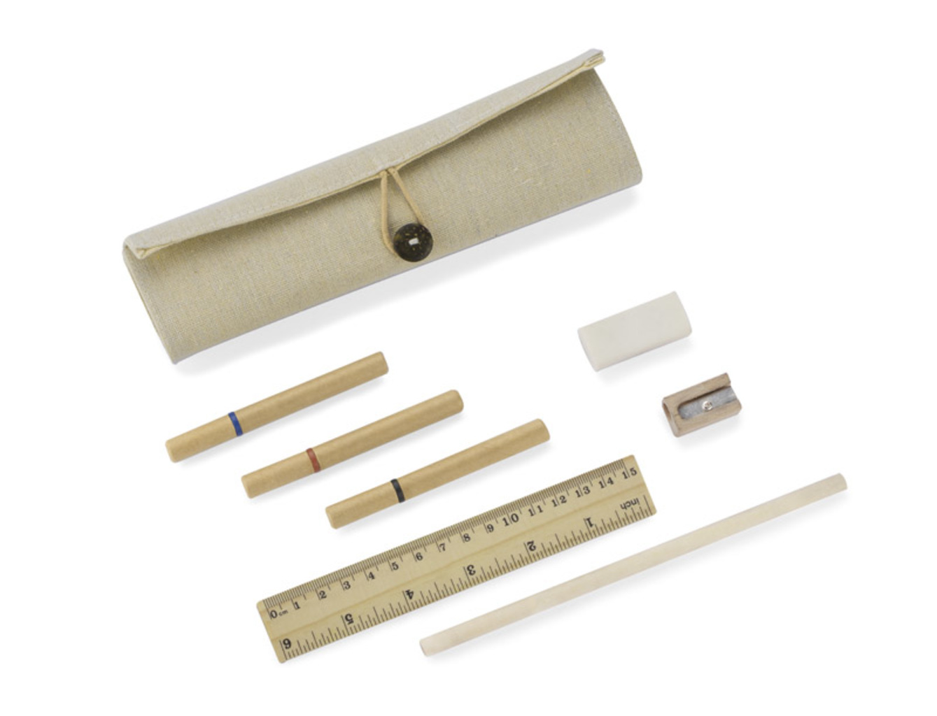 Ekologická pouzdro na tužky vyrobené z bavlněného lnu. Uzavřeno knoflíkem. Soubor obsahuje 3 ekologické kuličkové pera (černé, modré, červené), tužku, tužkovač, gumu, pravítko. Logo bude tisknuto.
