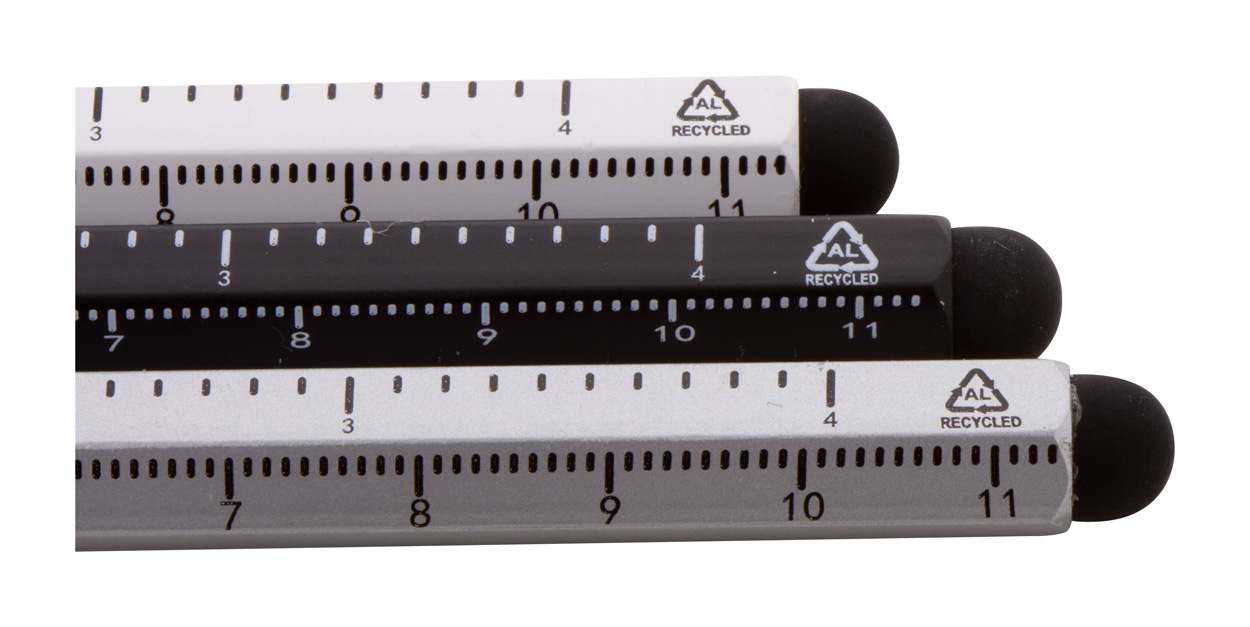 Bez inkoustové pero s dlouhou životností z recyklovaného hliníku s dotykovým stylusem a hrotem z kovové slitiny, který oxiduje papír. S šestihrannou hlavní včetně pravítek 11 cm a 4 palce. Toto pero píše podobně jako tužka a navíc je stíratelné.