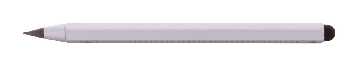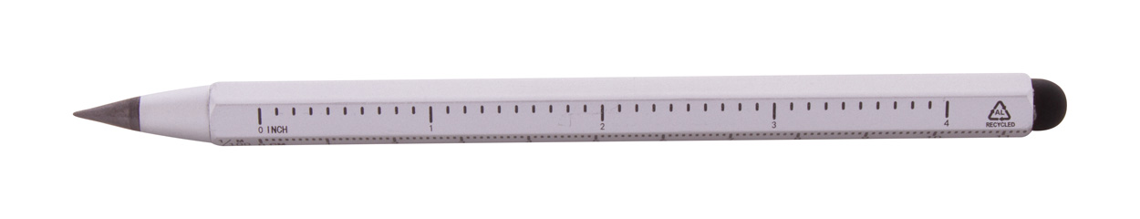 Bez inkoustové pero s dlouhou životností z recyklovaného hliníku s dotykovým stylusem a hrotem z kovové slitiny, který oxiduje papír. S šestihrannou hlavní včetně pravítek 11 cm a 4 palce. Toto pero píše podobně jako tužka a navíc je stíratelné.