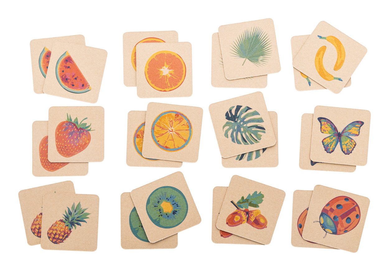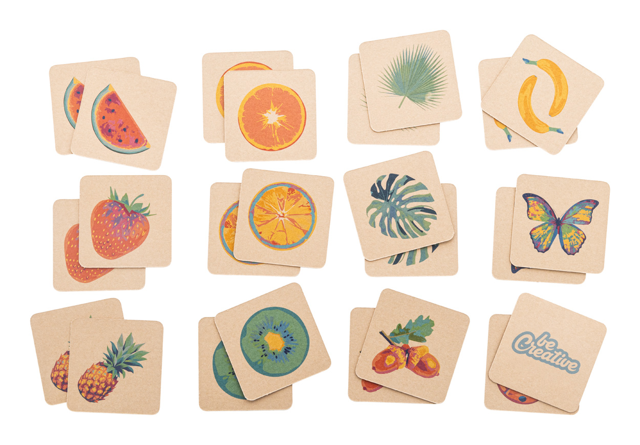 Pexeso z kraftového papíru na zakázku v kraftové papírové krabičce. S 24 dlaždicemi (55x55 mm). Cena zahrnuje 12 různých plnobarevných potisků na přední straně dlaždic, 1 plnobarevný potisk na zadní straně všech dlaždic a plnobarevně potištěnou krabičku, nezahrnuje tiskovou přípravu. Min. mn.: 250 ks.