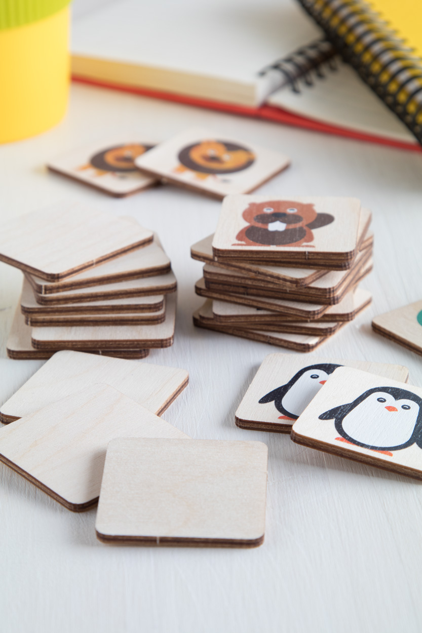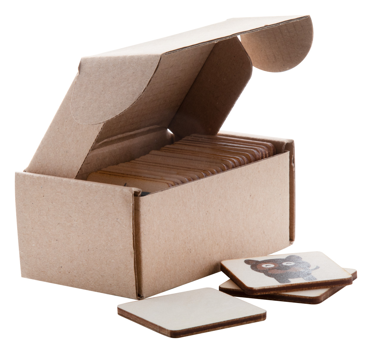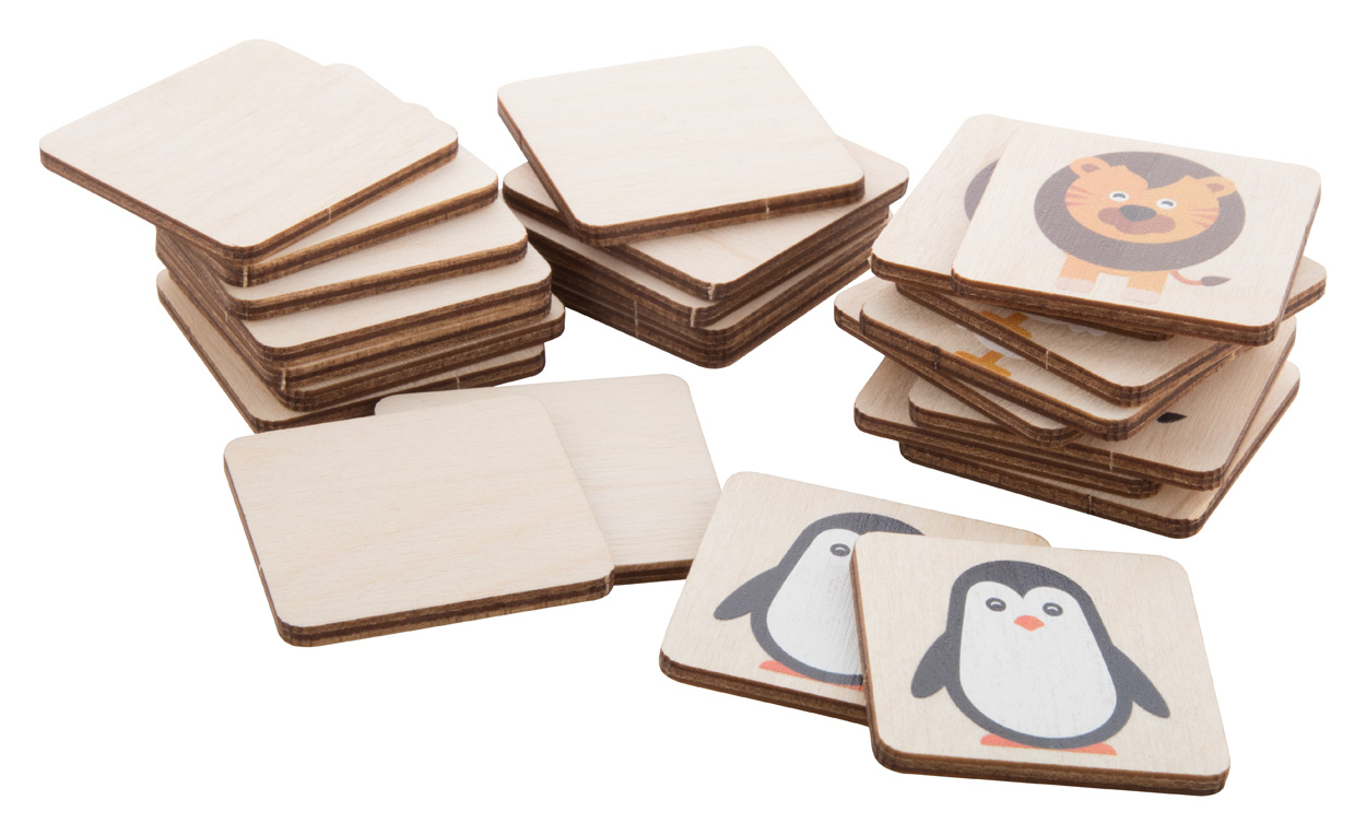 Polaminované pexeso z břízy s vlastní grafikou. S 24 dílky (40x40 mm). Cena zahrnuje 12 různých plnobarevných potisků na přední straně dílků a 1 barevný potisk loga na zadní straně všech dílků, nezahrnuje tiskovou přípravu. Min. mn.: 50 ks.