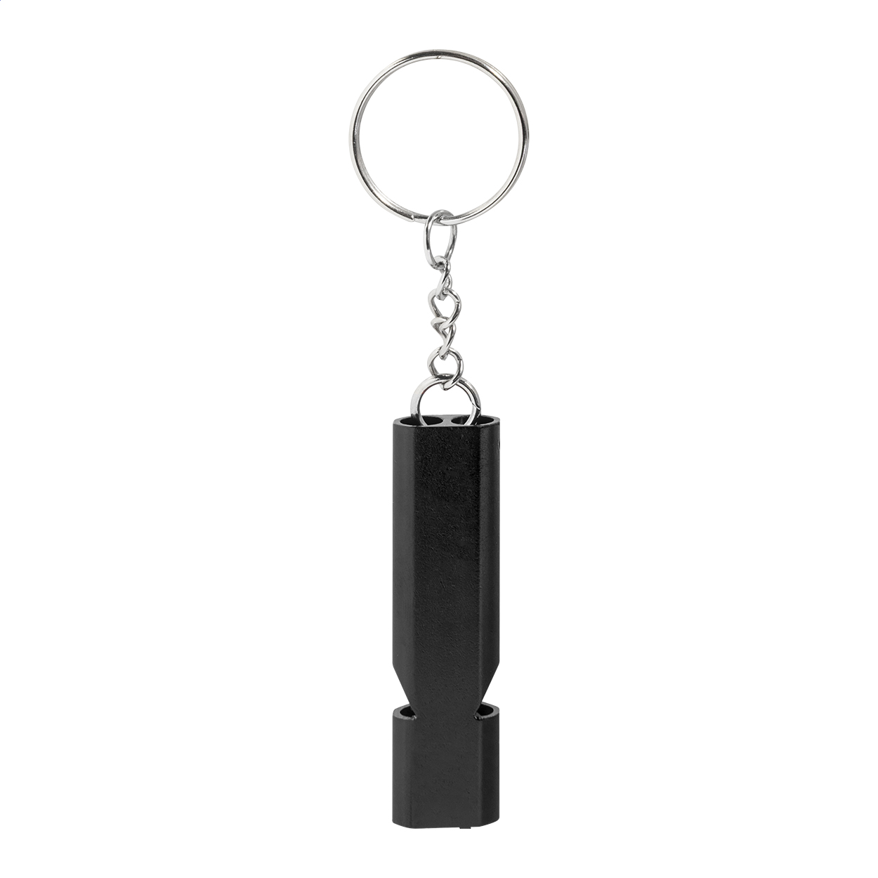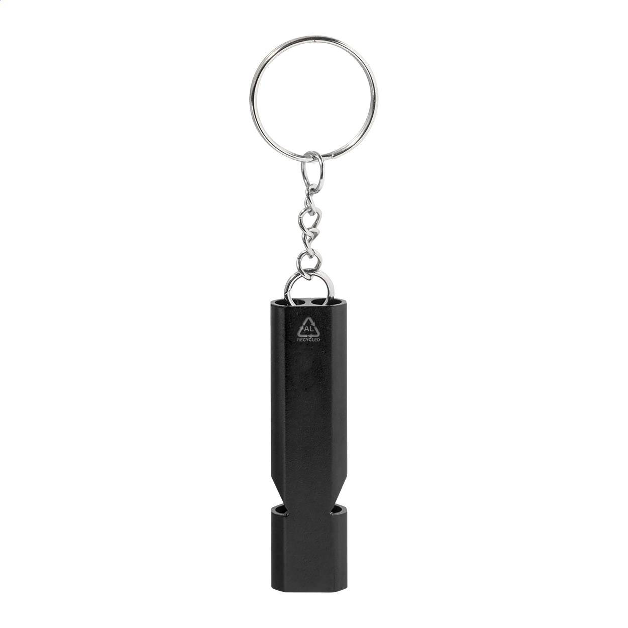 Píšťalka z recyklovaného hliníku s kovovým kroužkem na klíče.