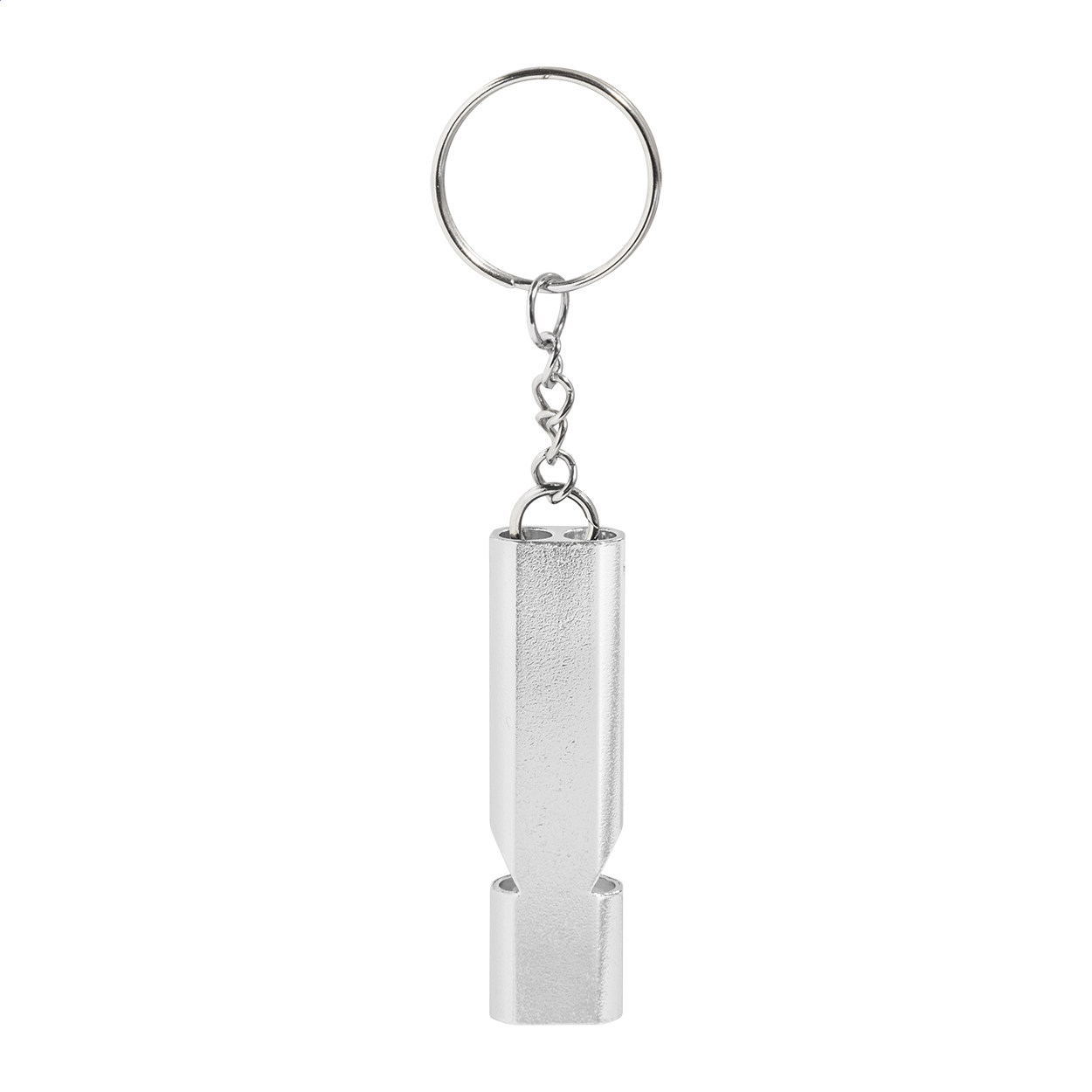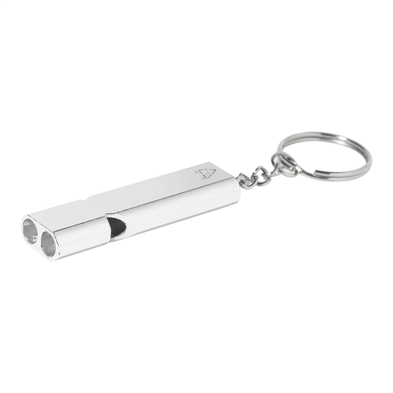 Píšťalka z recyklovaného hliníku s kovovým kroužkem na klíče.