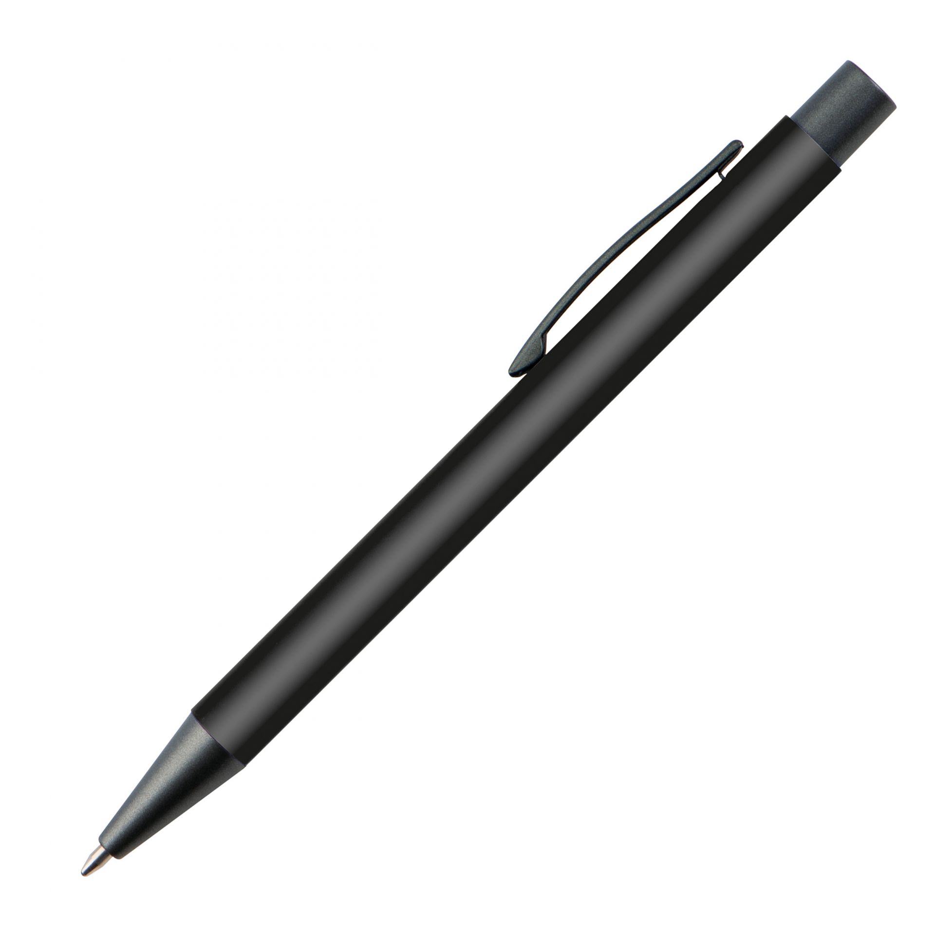 Plastové kuličkové pero s modrou náplní, barevným hřídelkem a kovovým klipem.