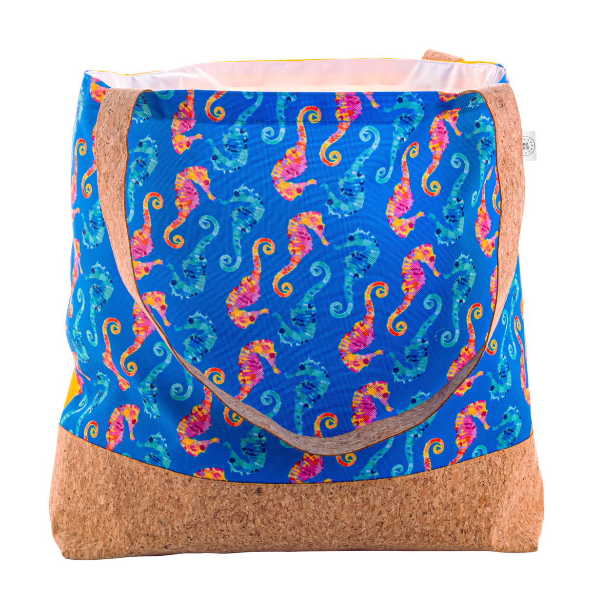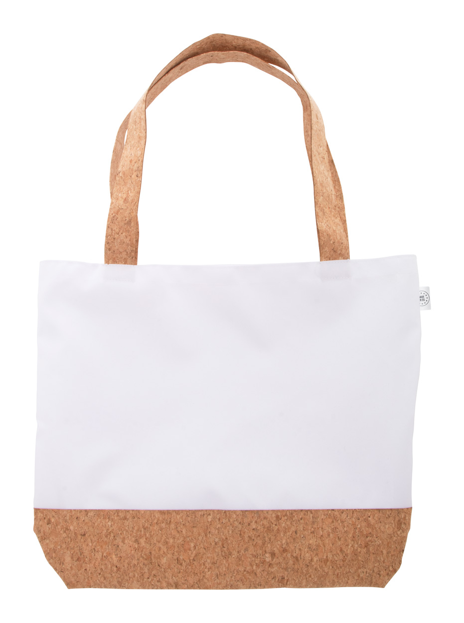 Plážová taška vyrobená na zakázku z polyesteru 600D RPET a přírodního korku, se štítkem RPET. Cena zahrnuje celoplošně tištěnou sublimační grafiku, nezahrnuje tiskovou přípravu. Min. mn. 50 ks.