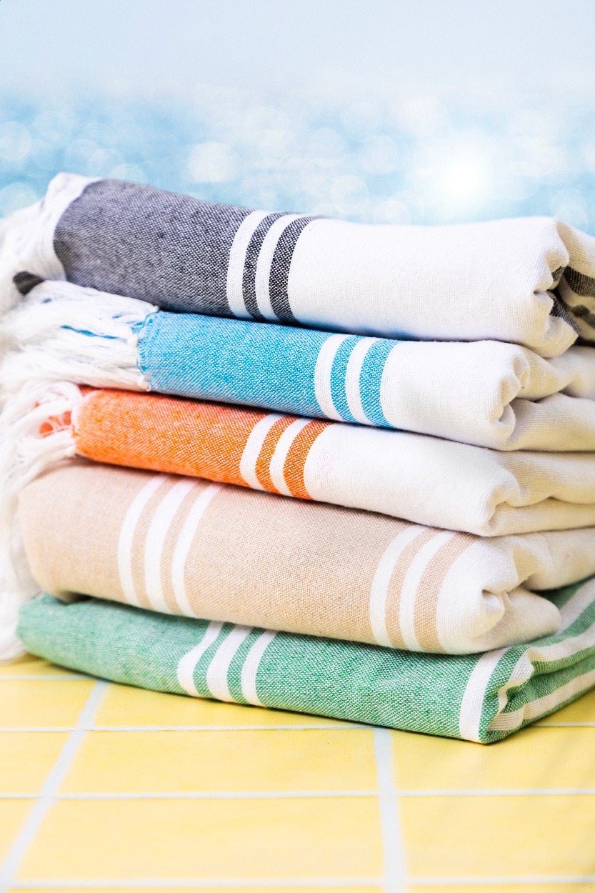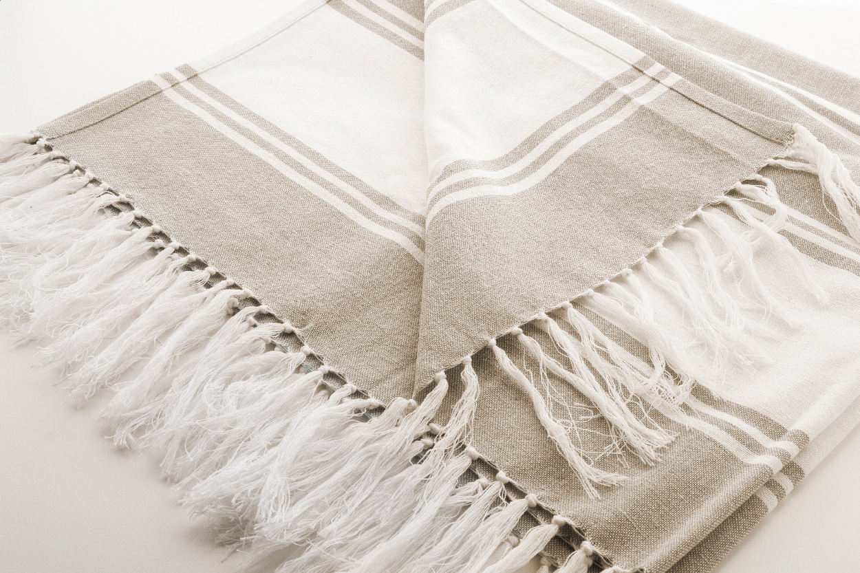 Dvoubarevný pruhovaný plážový ručník pareo ze 70% bavlny a 30% polyesteru. 210 g/m².