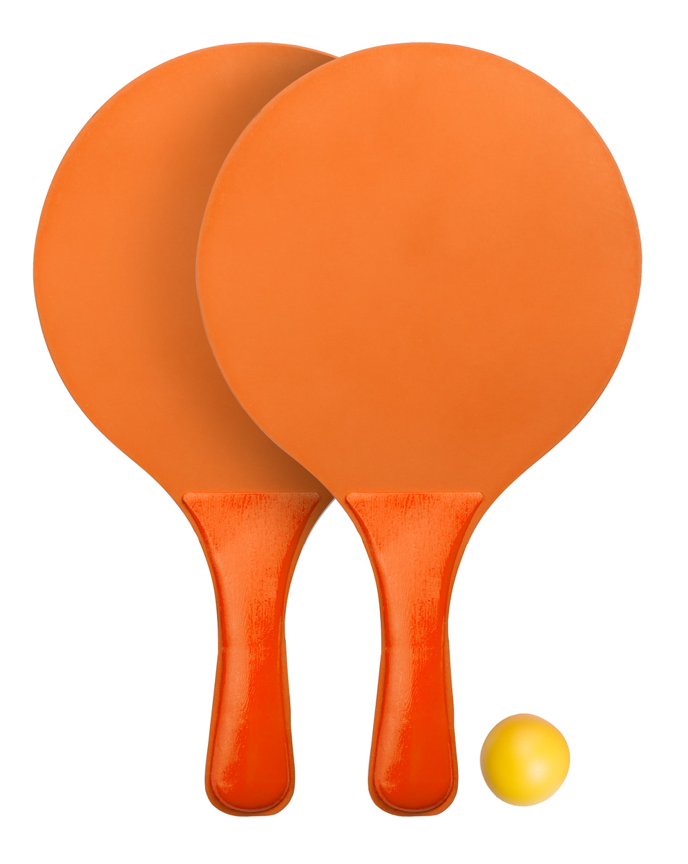 Plážový tenis s barevnými raketami a jedním míčkem, vyrobeno ze dřeva a plastu.